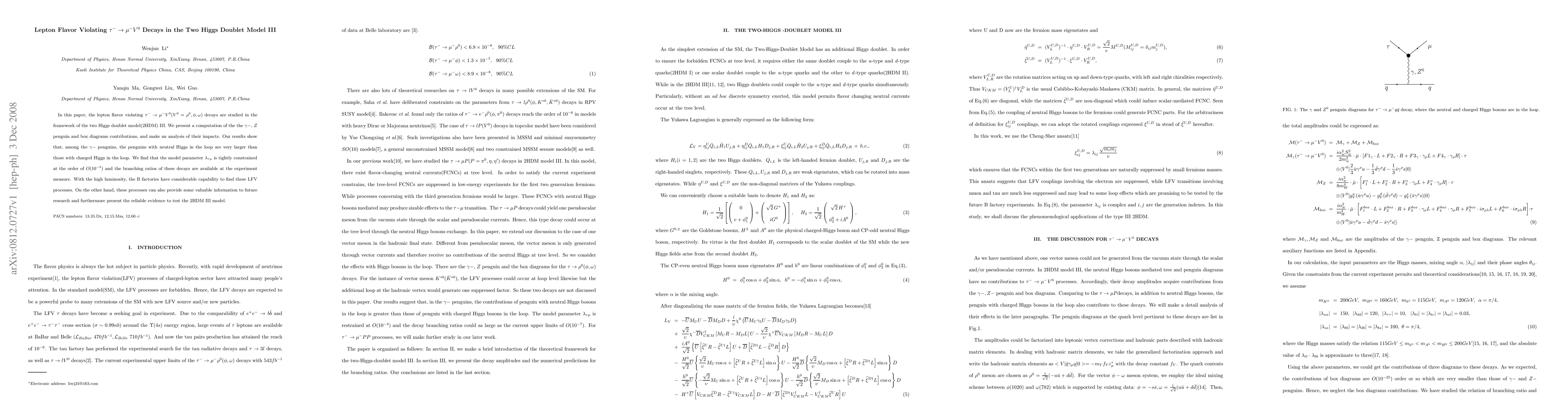 This paper investigates lepton flavor violating decays $\tau^- \to \mu^- V^0$ in the Two Higgs Doublet Model III, analyzing contributions from $\gamma-$, $Z$ penguin, and box diagrams. The study finds that neutral Higgs loops significantly enhance the decay rates, with the model parameter $\lambda_{\tau\mu}$ constrained to $O(10^{-3})$, and suggests that B factories could detect these processes with high luminosity.