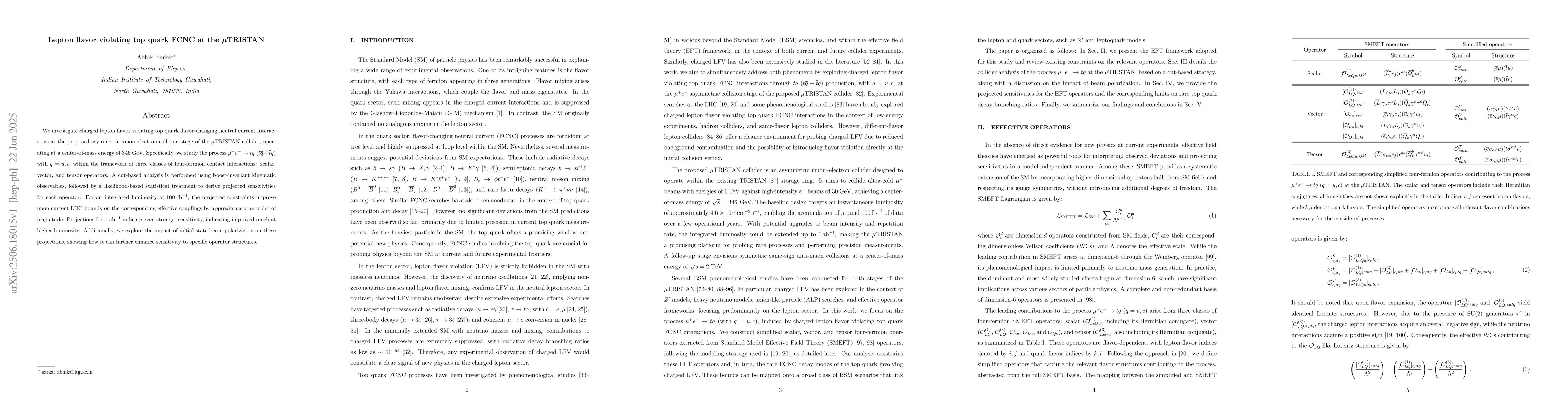 We investigate charged lepton flavor violating top quark flavor-changing neutral current interactions at the proposed asymmetric muon-electron collision stage of the $\mu$TRISTAN collider, operating at a center-of-mass energy of 346 GeV. Specifically, we study the process $\mu^{+} e^{-} \rightarrow t q$ ($t \overline{q} + \overline{t}q$) with $q = u, c$, within the framework of three classes of four-fermion contact interactions: scalar, vector, and tensor operators. A cut-based analysis is performed using boost-invariant kinematic observables, followed by a likelihood-based statistical treatment to derive projected sensitivities for each operator. For an integrated luminosity of $100~\text{fb}^{-1}$, the projected constraints improve upon current LHC bounds on the corresponding effective couplings by approximately an order of magnitude. Projections for $1~\text{ab}^{-1}$ indicate even stronger sensitivity, indicating improved reach at higher luminosity. Additionally, we explore the impact of initial-state beam polarization on these projections, showing how it can further enhance sensitivity to specific operator structures.