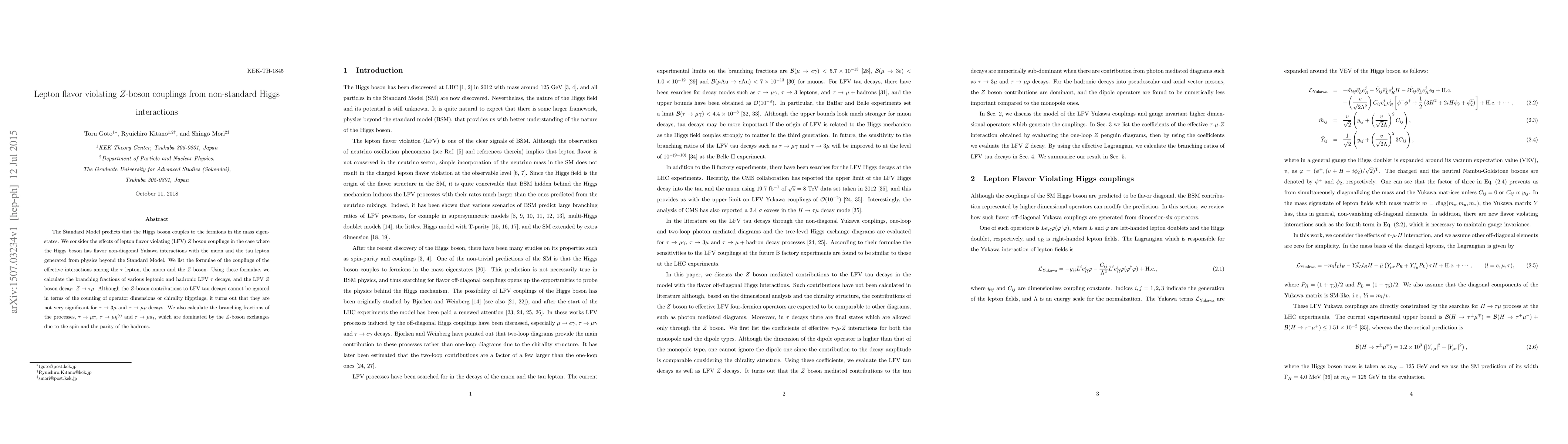 This paper investigates lepton flavor violating (LFV) $Z$-boson couplings arising from non-standard Higgs interactions, specifically focusing on flavor non-diagonal Yukawa interactions between the Higgs boson and the muon and tau leptons. It calculates the branching fractions for various LFV decays, finding that while $Z$-boson contributions are significant for some processes, they are less significant for $\tau\to3\mu$ and $\tau\to\mu\rho$ decays.