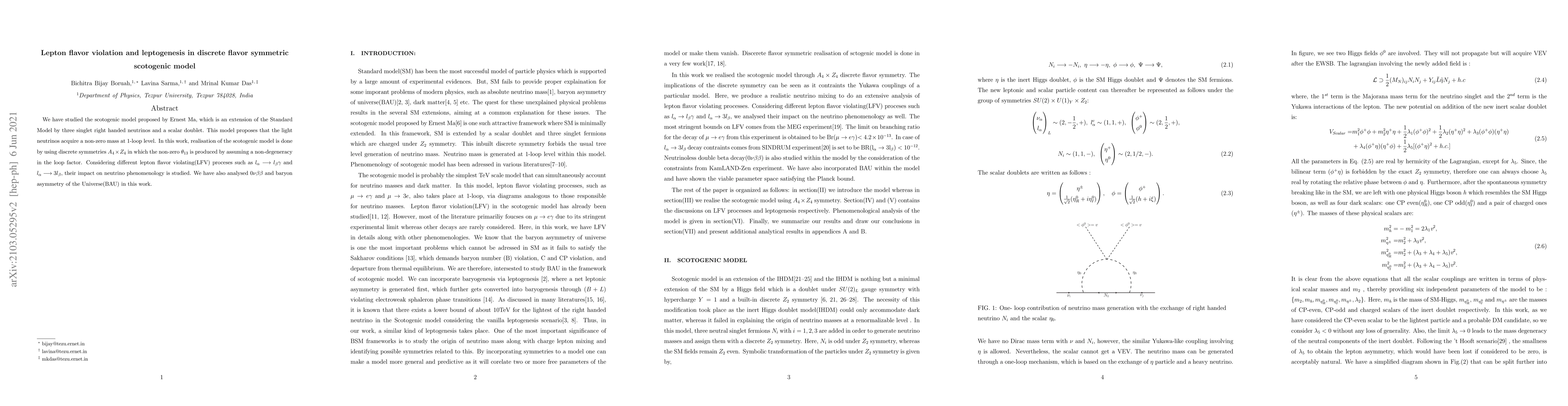 We have studied the scotogenic model proposed by Ernest Ma, which is an extension of the Standard Model by three singlet right-handed neutrinos and a scalar doublet. This model proposes that the light neutrinos acquire a non-zero mass at 1-loop level. In this work, the realisation of the scotogenic model is done by using discrete symmetries $A_{4}\times Z_{4}$ in which the non-zero $\theta_{13}$ is produced by assuming a non-degeneracy in the loop factor. Considering different lepton flavor violating(LFV) processes such as $l_{\alpha}\longrightarrow l_{\beta}\gamma$ and $l_{\alpha}\longrightarrow 3l_{\beta}$, their impact on neutrino phenomenology is studied. We have also analysed $0\nu\beta\beta$ and baryon asymmetry of the Universe (BAU) in this work.