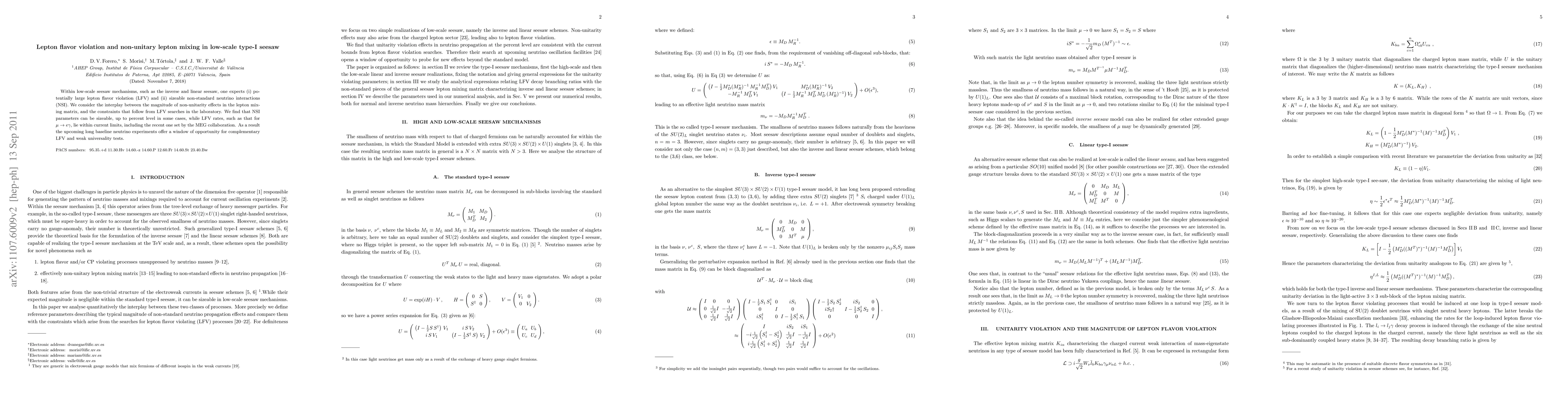 Within low-scale seesaw mechanisms, such as the inverse and linear seesaw, one expects (i) potentially large lepton flavor violation (LFV) and (ii) sizeable non-standard neutrino interactions (NSI). We consider the interplay between the magnitude of non-unitarity effects in the lepton mixing matrix, and the constraints that follow from LFV searches in the laboratory. We find that NSI parameters can be sizeable, up to percent level in some cases, while LFV rates, such as that for \mu -> e \gamma, lie within current limits, including the recent one set by the MEG collaboration. As a result the upcoming long baseline neutrino experiments offer a window of opportunity for complementary LFV and weak universality tests.