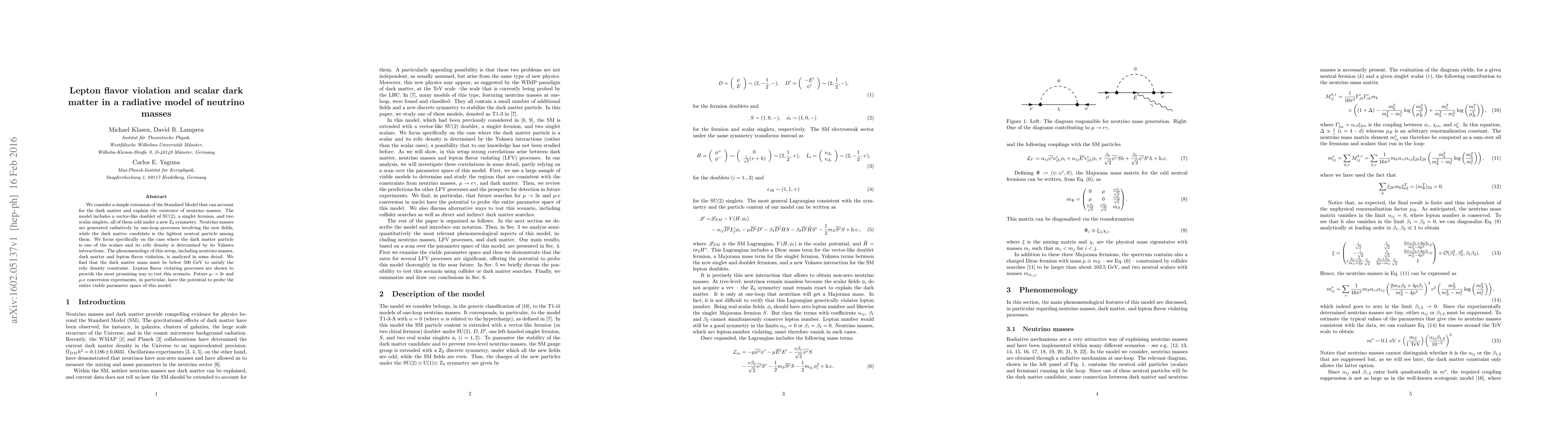 This paper proposes a model extending the Standard Model to include dark matter and radiatively generated neutrino masses, featuring a vector-like doublet, a singlet fermion, and scalar singlets. The dark matter candidate is a scalar with a mass below 500 GeV, and lepton flavor violation processes are highlighted as key tests for the model, particularly in upcoming muon-to-electron conversion experiments.