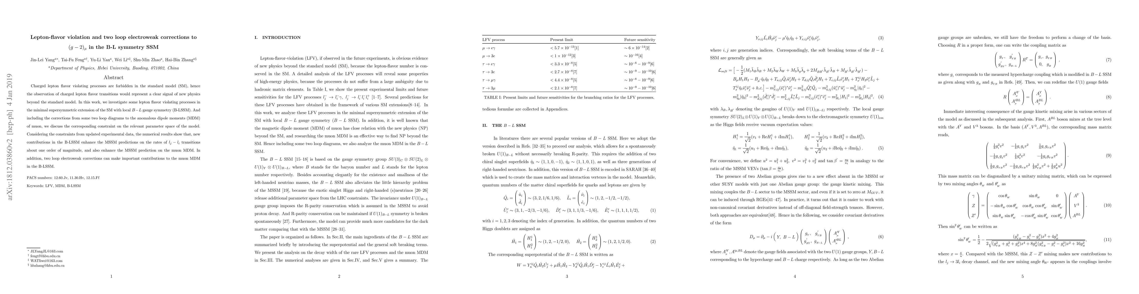This paper examines lepton flavor violation in the B-L symmetry SSM, finding that new contributions significantly enhance MSSM predictions for flavor transitions and muon anomalous dipole moments. It also highlights the importance of two-loop electroweak corrections in the B-LSSM for muon MDM.