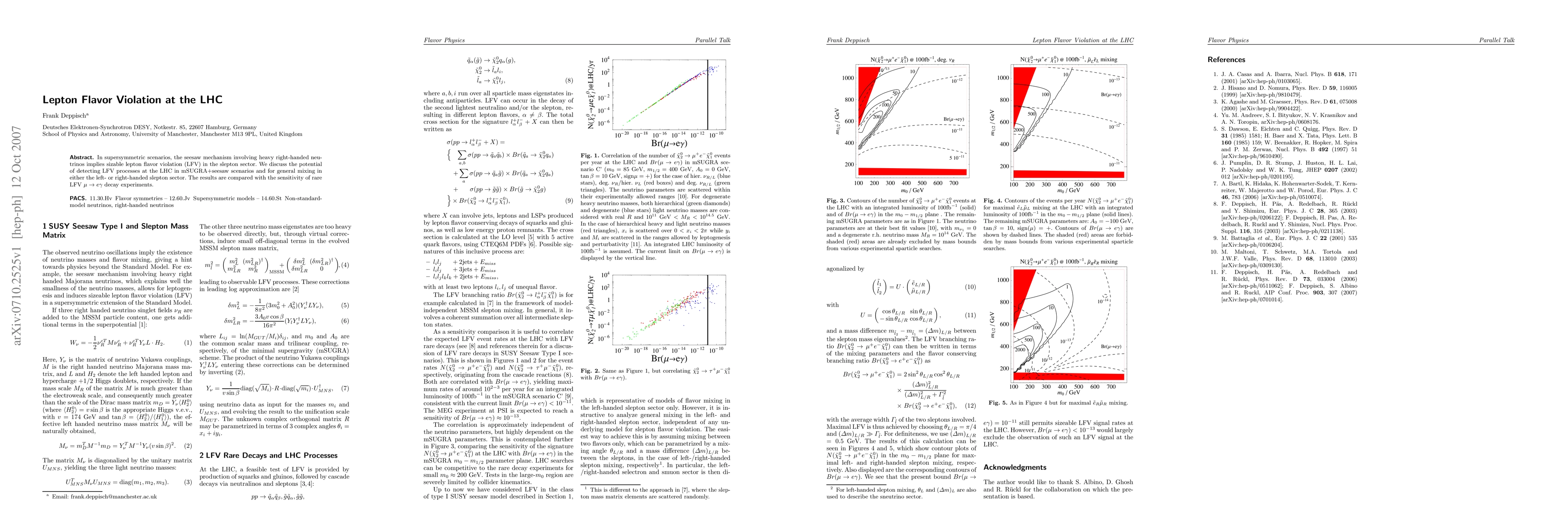This paper explores the potential of the LHC to detect lepton flavor violation (LFV) in supersymmetric scenarios, particularly within the context of mSUGRA+seesaw models involving heavy right-handed neutrinos. It compares LHC detection prospects with the sensitivity of rare LFV decay experiments like mu -> e gamma.