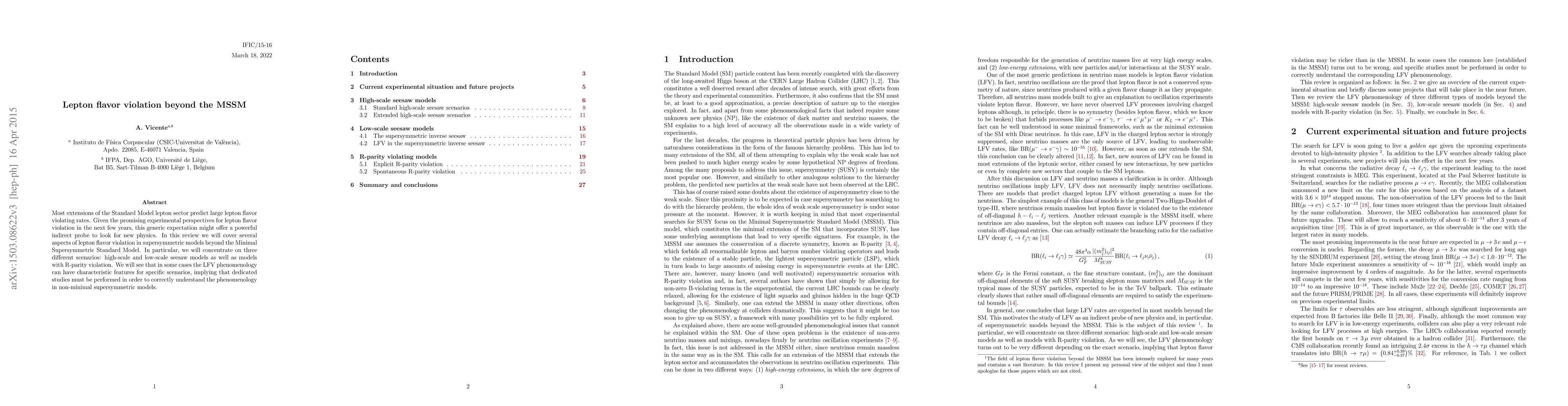 This review explores lepton flavor violation (LFV) in supersymmetric models beyond the Minimal Supersymmetric Standard Model (MSSM), focusing on high-scale and low-scale seesaw mechanisms and R-parity violating models. It emphasizes that distinct LFV phenomena may emerge in specific scenarios, necessitating tailored studies for a comprehensive understanding.