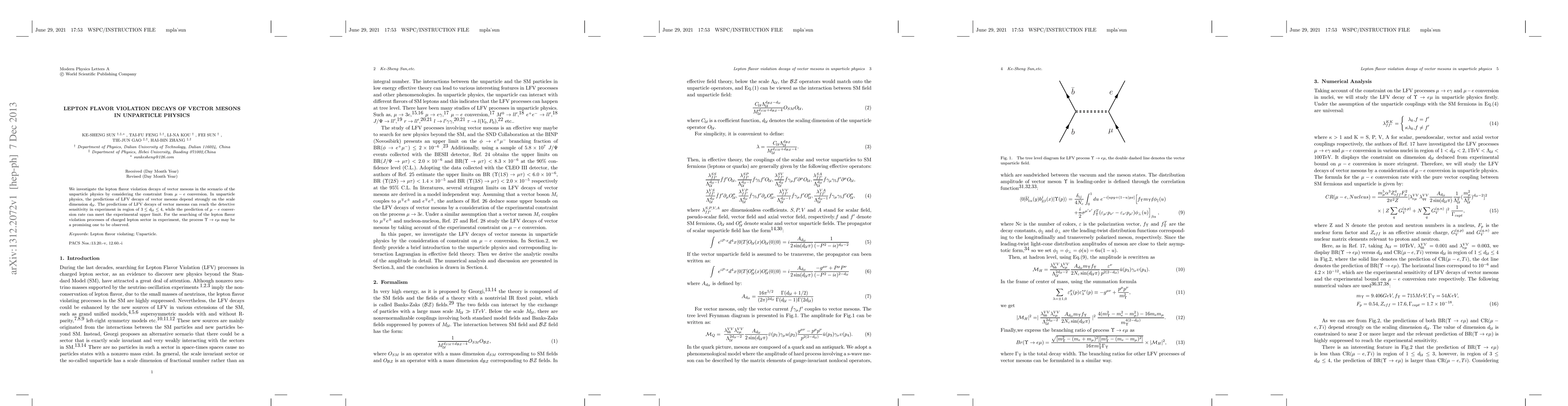 This paper explores lepton flavor violation (LFV) decays of vector mesons within the framework of unparticle physics, focusing on the $\mu-e$ conversion constraint. It finds that LFV decays can be detected in the unparticle scale dimension range of $3\le d_{\mathcal{U}}\le 4$, with the $\Upsilon\rightarrow e\mu$ process being a promising candidate for experimental observation.