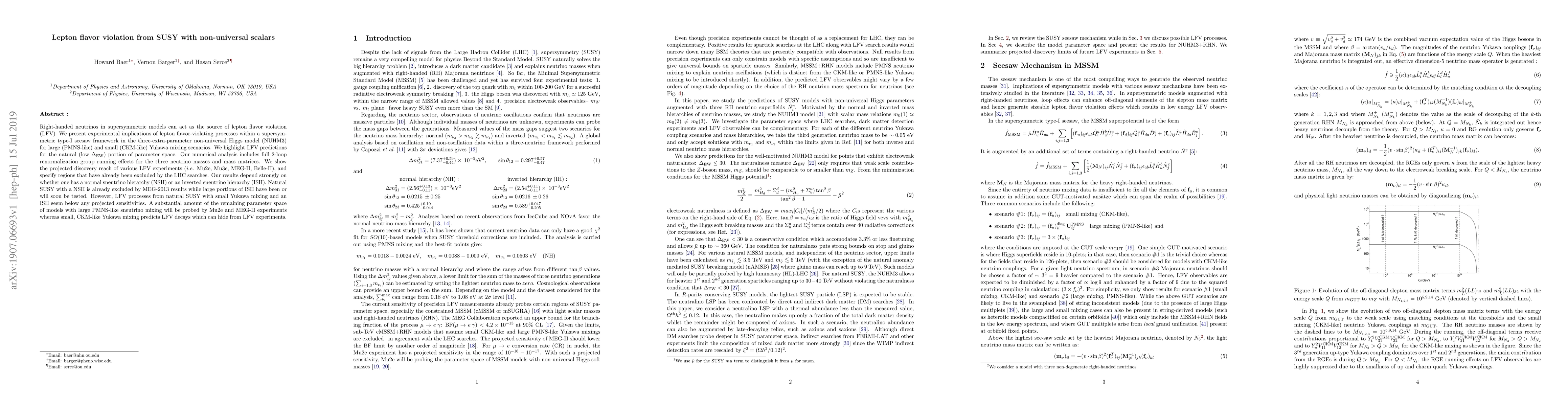 This paper explores lepton flavor violation (LFV) in supersymmetric models with non-universal Higgs scalars, focusing on right-handed neutrinos within a type-I seesaw framework. It analyzes LFV predictions in the NUHM3 model under large and small Yukawa mixing scenarios, highlighting implications for experiments like Mu2e, Mu3e, MEG-II, and Belle-II.