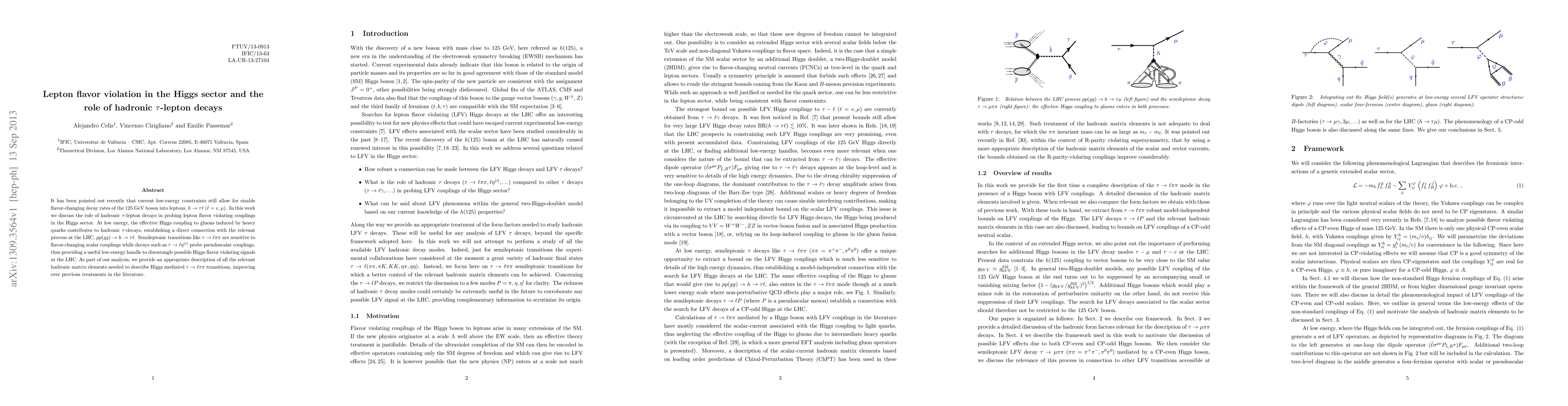 This paper explores the potential of hadronic tau-lepton decays to probe lepton flavor violation in the Higgs sector, emphasizing the role of semileptonic and pseudoscalar decays in detecting flavor-changing Higgs couplings. It provides an improved description of the relevant hadronic matrix elements for Higgs-mediated tau decays, offering a low-energy approach to identifying possible Higgs flavor-violating signals at the LHC.