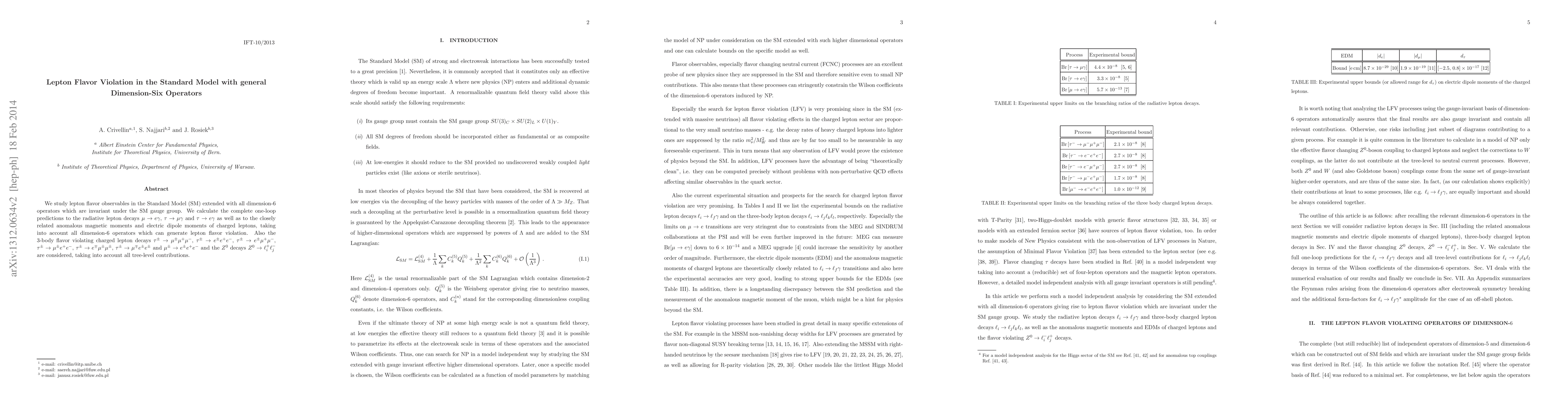 This paper investigates lepton flavor violation (LFV) in the Standard Model augmented with all dimension-$6$ operators, calculating one-loop predictions for radiative decays and magnetic/electric dipole moments, as well as tree-level contributions for various 3-body LFV decays and $Z^0$ decays.