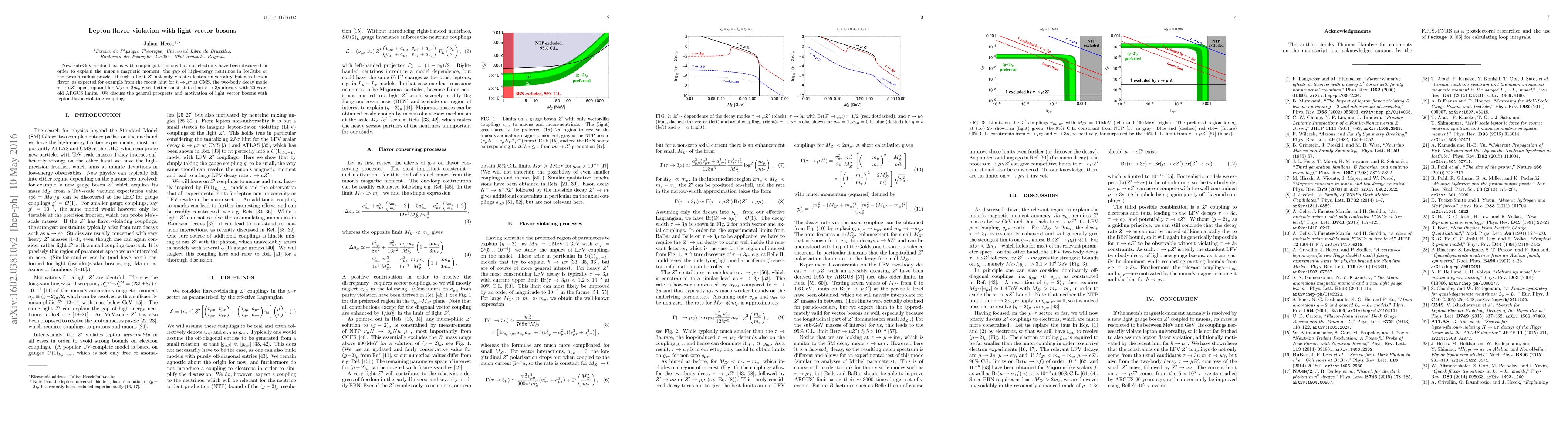 New sub-GeV vector bosons with couplings to muons but not electrons have been discussed in order to explain the muon's magnetic moment, the gap of high-energy neutrinos in IceCube or the proton radius puzzle. If such a light Z' not only violates lepton universality but also lepton flavor, as expected for example from the recent hint for $h\to\mu\tau$ at CMS, the two-body decay mode $\tau \to \mu Z'$ opens up and for $M_{Z'} < 2 m_\mu$ gives better constraints than $\tau\to 3\mu$ already with 20-year-old ARGUS limits. We discuss the general prospects and motivation of light vector bosons with lepton-flavor-violating couplings.