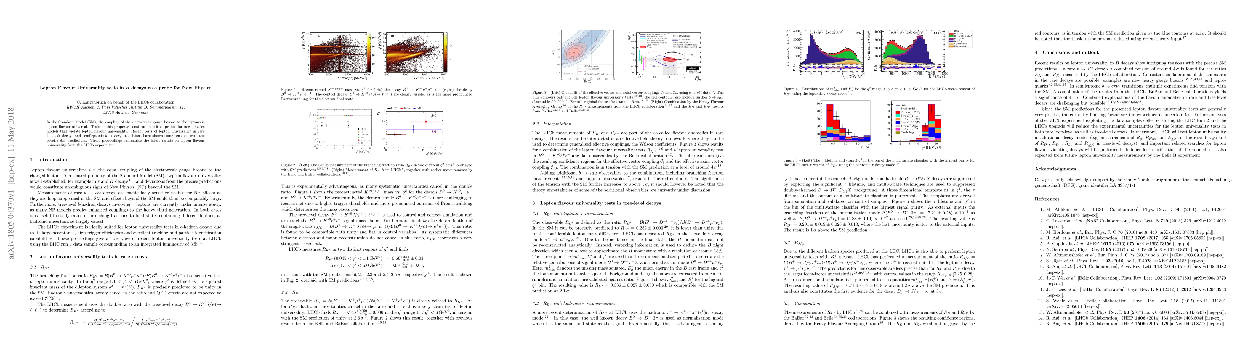 This paper discusses tests of lepton flavour universality in $B$ meson decays conducted by the LHCb experiment, identifying potential deviations from Standard Model predictions that could hint at new physics. Recent results reveal tensions in rare $b\to s\ell\ell$ decays and semileptonic $b\to c\tau\bar{\nu}_\tau$ transitions.