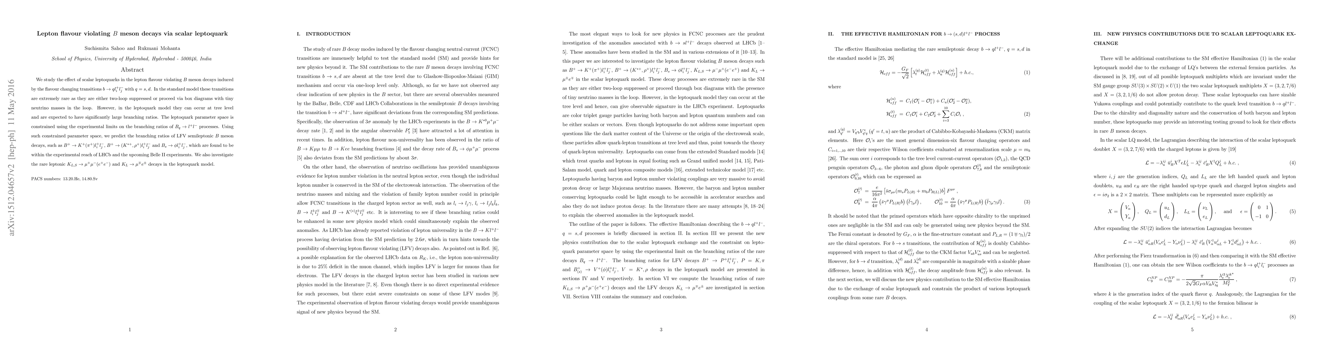 The paper presents a detailed theoretical framework for calculating branching ratios of LFV B meson decays mediated by scalar leptoquarks, including form factor parametrizations and kinematic analysis.