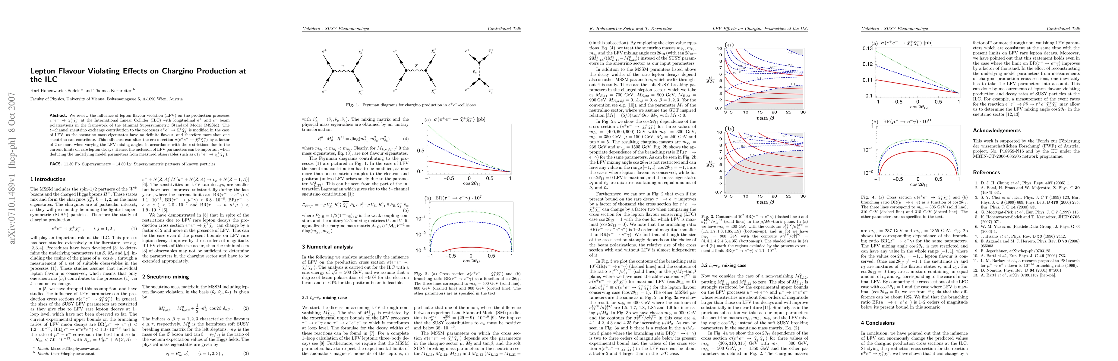 We review the influence of lepton flavour violation (LFV) on the production processes e+e- -> ~chi+_i ~chi-_j at the International Linear Collider (ILC) with longitudinal e+ and e- beam polarizations in the framework of the Minimal Supersymmetric Standard Model (MSSM). The t-channel sneutrino exchange contribution to the processes e+e- -> ~chi+_i ~chi-_j is modified in the case of LFV, as the sneutrino mass eigenstates have no definite flavour, and therefore more than one sneutrino can contribute. This influence can alter the cross section sigma(e+e- -> ~chi+_1 ~chi-_1) by a factor of 2 or more when varying the LFV mixing angles, in accordance with the restrictions due to the current limits on rare lepton decays. Hence, the inclusion of LFV parameters can be important when deducing the underlying model parameters from measured observables such as sigma(e+e- -> ~chi+_1 ~chi-_1).