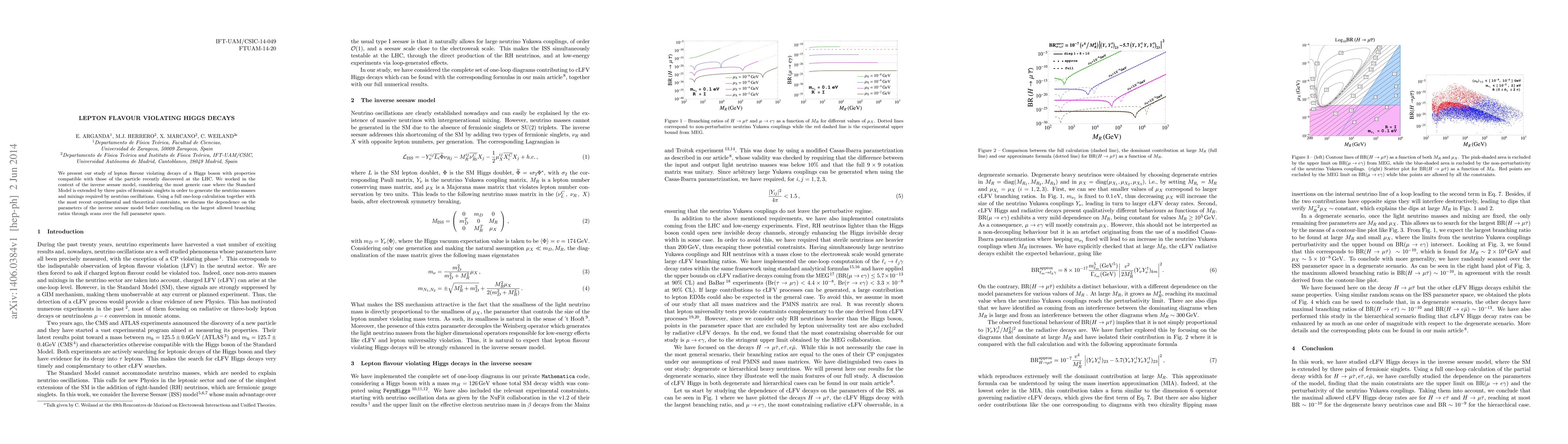 We present our study of lepton flavour violating decays of a Higgs boson with properties compatible with those of the particle recently discovered at the LHC. We worked in the context of the inverse seesaw model, considering the most generic case where the Standard Model is extended by three pairs of fermionic singlets in order to generate the neutrino masses and mixings required by neutrino oscillations. Using a full one-loop calculation together with the most recent experimental and theoretical constraints, we discuss the dependence on the parameters of the inverse seesaw model before concluding on the largest allowed branching ratios through scans over the full parameter space.