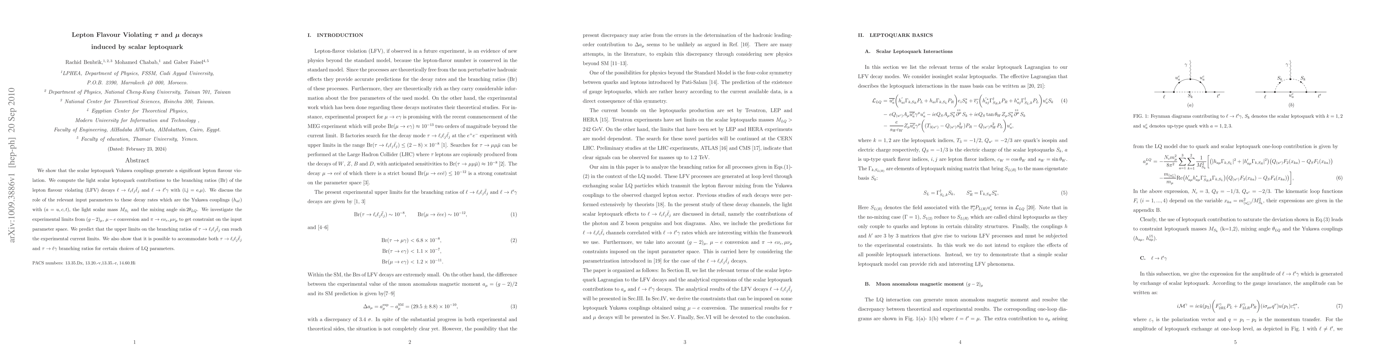 This paper investigates how scalar leptoquarks can induce significant lepton flavour violation in tau and muon decays, computing their contributions to branching ratios of LFV decays. It explores the impact of Yukawa couplings, leptoquark mass, and mixing angle, and discusses how experimental limits constrain the parameter space.