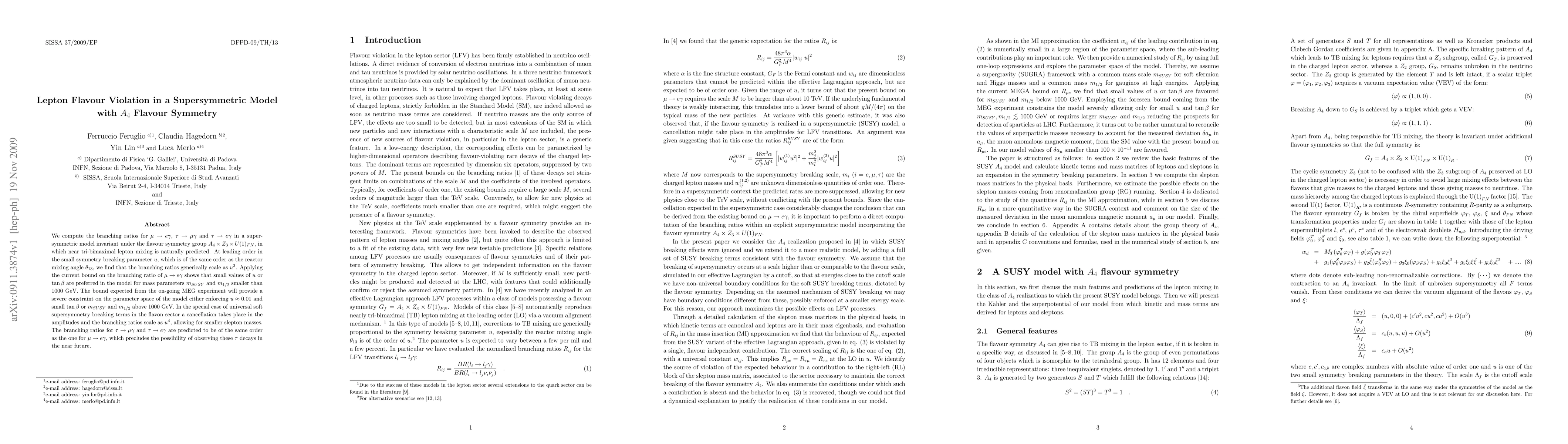This paper investigates lepton flavour violation in a supersymmetric model with A4 flavour symmetry, finding that branching ratios for processes like mu -> e gamma scale as u^2. Current experimental bounds suggest small values of u or tan(beta) for low SUSY masses, while future MEG experiment results may constrain the model's parameter space.