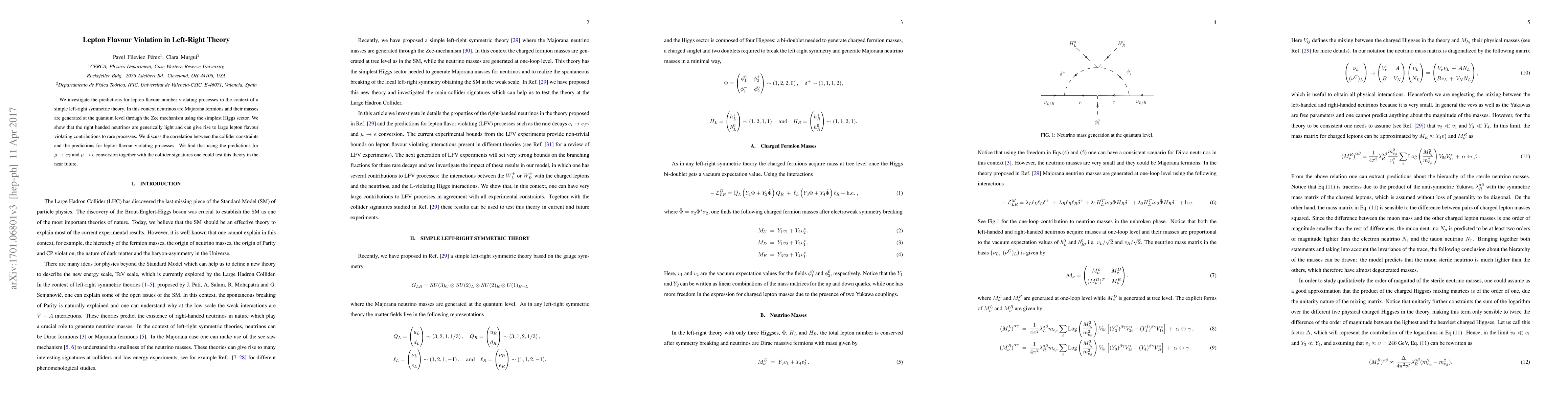 This paper explores lepton flavour violation in a left-right symmetric theory where neutrinos are Majorana fermions. It predicts that light right-handed neutrinos can significantly contribute to rare lepton number violating processes, and suggests that these predictions can be tested using both collider constraints and processes like mu to e gamma and mu to e conversion.