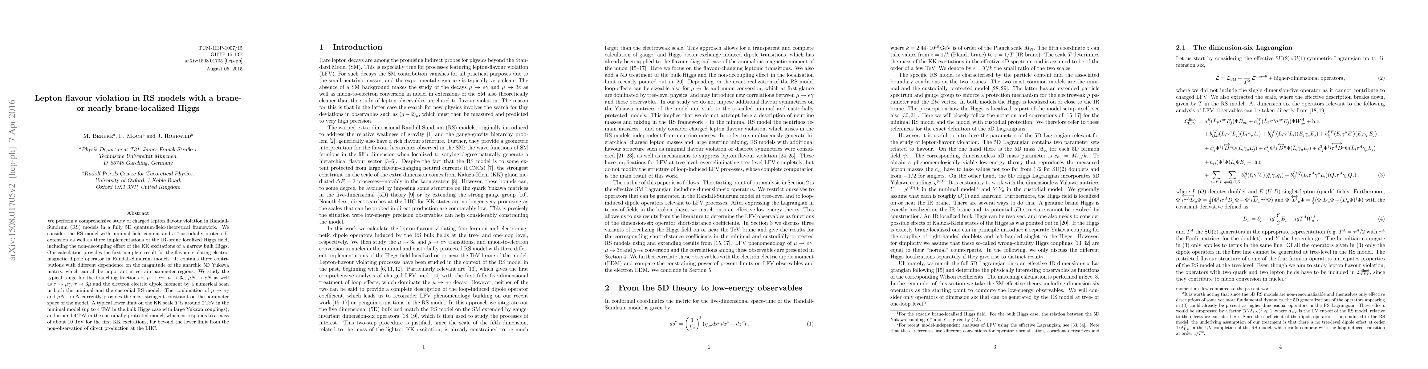 This paper investigates charged lepton flavor violation in Randall-Sundrum models with a brane-localized Higgs, providing the first complete result for the electromagnetic dipole operator. It finds that the branching fractions for various flavor-violating decays and the electron electric dipole moment are constrained by the combination of mu -> e gamma and mu N -> e N, with typical lower limits on the KK scale around 2-4 TeV.
