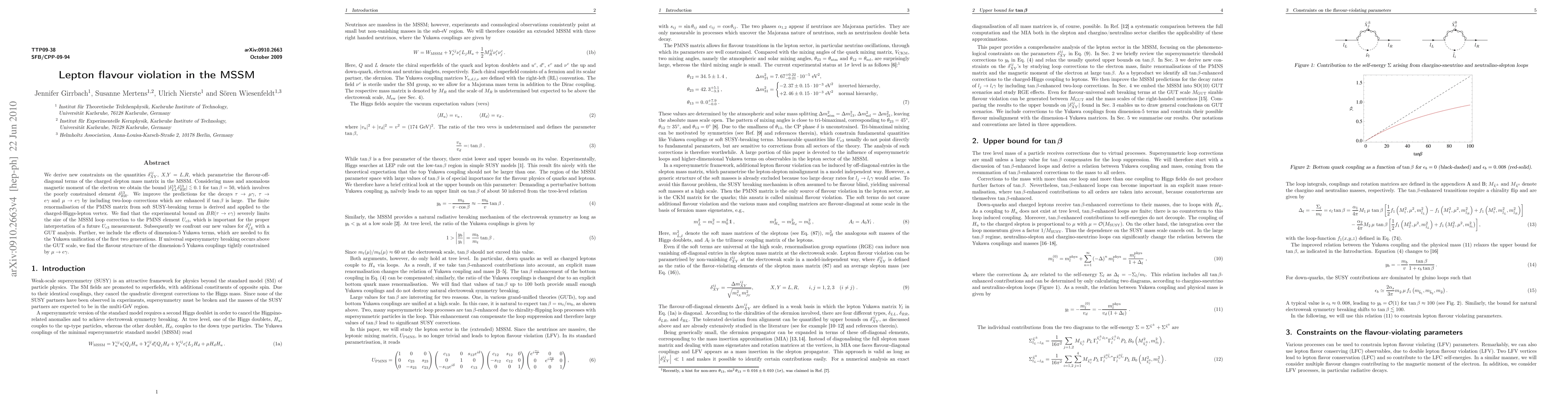 We derive new constraints on the quantities delta_{XY}^{ij}, X,Y=L,R, which parametrise the flavour-off-diagonal terms of the charged slepton mass matrix in the MSSM. Considering mass and anomalous magnetic moment of the electron we obtain the bound |delta^{13}_{LL} delta^{13}_{RR}|<0.1 for tan beta=50, which involves the poorly constrained element delta^{13}_{RR}. We improve the predictions for the decays tau -> mu gamma, tau -> e gamma and mu -> e gamma by including two-loop corrections which are enhanced if tan beta is large. The finite renormalisation of the PMNS matrix from soft SUSY-breaking terms is derived and applied to the charged-Higgs-lepton vertex. We find that the experimental bound on BR(tau -> e gamma) severely limits the size of the MSSM loop correction to the PMNS element U_{e3}, which is important for the proper interpretation of a future U_{e3} measurement. Subsequently we confront our new values for delta^{ij}_{LL} with a GUT analysis. Further, we include the effects of dimension-5 Yukawa terms, which are needed to fix the Yukawa unification of the first two generations. If universal supersymmetry breaking occurs above the GUT scale, we find the flavour structure of the dimension-5 Yukawa couplings tightly constrained by mu -> e gamma.
