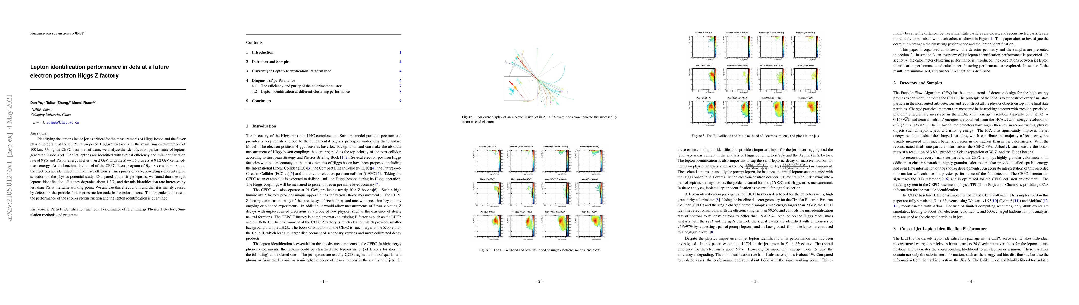 Researchers analyzed lepton identification performance in jets at a future electron-positron Higgs/Z factory, finding that jet leptons had slightly lower efficiency and mis-identification rates compared to single leptons.