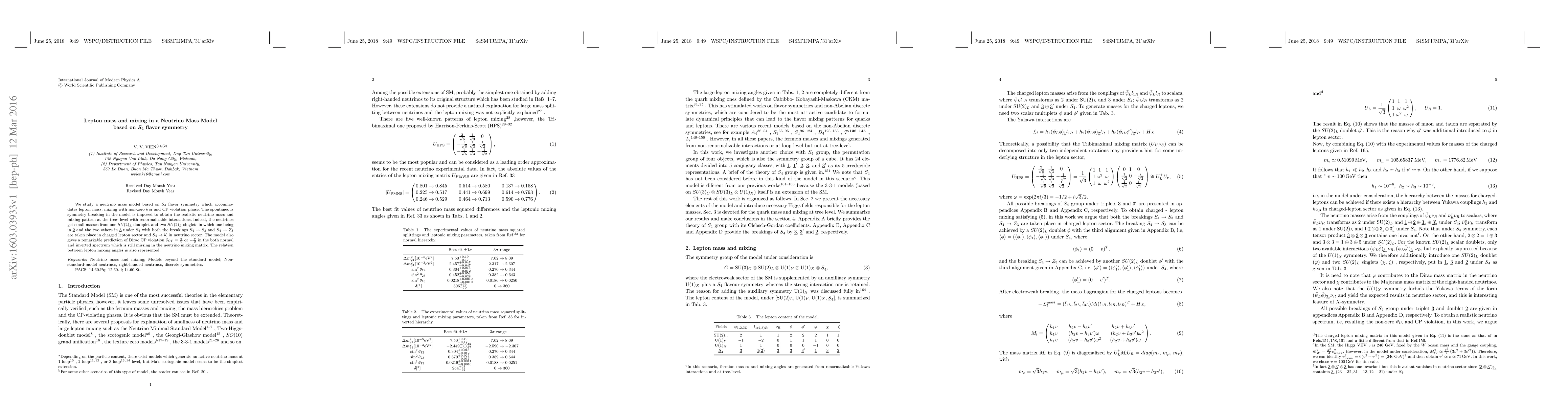We study a neutrino mass model based on $S_4$ flavor symmetry which accommodates lepton mass, mixing with non-zero $\theta_{13}$ and CP violation phase. The spontaneous symmetry breaking in the model is imposed to obtain the realistic neutrino mass and mixing pattern at the tree- level with renormalizable interactions. Indeed, the neutrinos get small masses from one $SU(2)_L$ doubplet and two $SU(2)_L$ singlets in which one being in $\underline{2}$ and the two others in $\underline{3}$ under $S_4$ with both the breakings $S_{4}\rightarrow S_3$ and $S_{4}\rightarrow Z_3$ are taken place in charged lepton sector and $S_4\rightarrow \mathcal{K}$ in neutrino sector. The model also gives a remarkable prediction of Dirac CP violation $\delta_{CP}=\frac{\pi}{2}$ or $-\frac{\pi}{2}$ in the both normal and inverted spectrum which is still missing in the neutrino mixing matrix. The relation between lepton mixing angles is also represented.