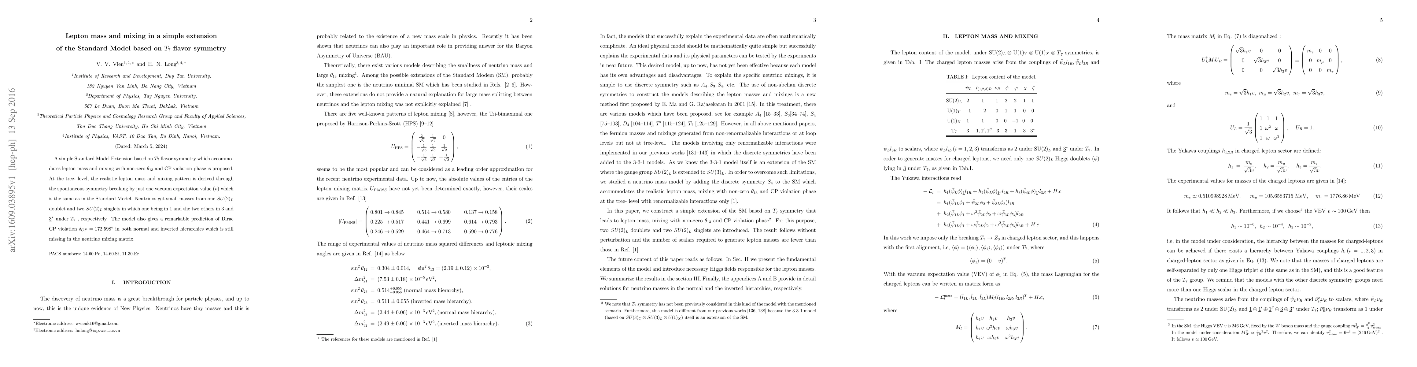 A simple Standard Model Extension based on $T_7$ flavor symmetry which accommodates lepton mass and mixing with non-zero $\theta_{13}$ and CP violation phase is proposed. At the tree- level, the realistic lepton mass and mixing pattern is derived through the spontaneous symmetry breaking by just one vacuum expectation value ($v$) which is the same as in the Standard Model. Neutrinos get small masses from one $SU(2)_L$ doublet and two $SU(2)_L$ singlets in which one being in $\underline{1}$ and the two others in $\underline{3}$ and $\underline{3}^*$ under $T_7$ , respectively. The model also gives a remarkable prediction of Dirac CP violation $\delta_{CP}=172.598^\circ$ in both normal and inverted hierarchies which is still missing in the neutrino mixing matrix.