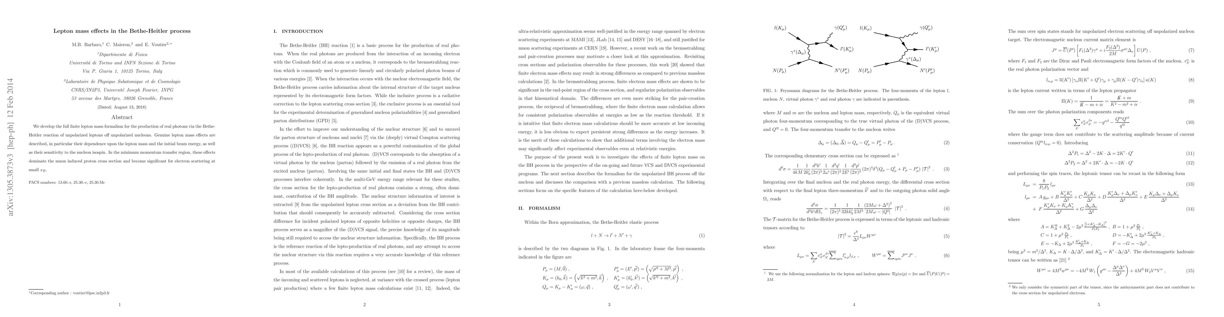 This paper presents a comprehensive finite lepton mass formalism for the Bethe-Heitler process, detailing the effects of lepton mass on photon production from unpolarized leptons interacting with unpolarized nucleons. The study highlights the dominance of these mass effects in the minimum momentum transfer region, particularly for muon-induced proton cross sections and electron scattering at small $x_B$.