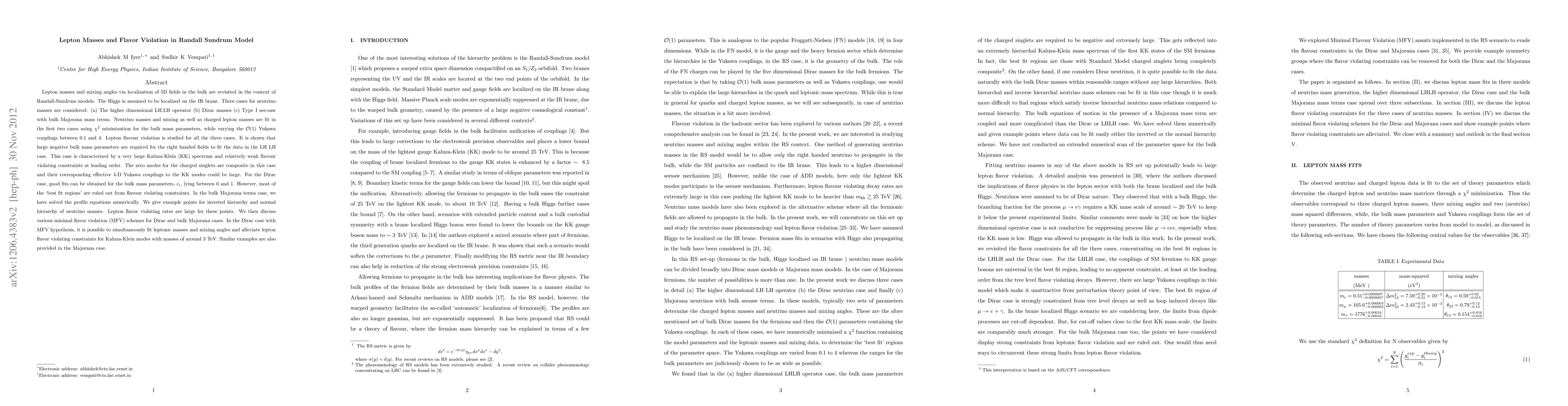 The paper presents detailed numerical fits and analyses of lepton masses and flavor violation in Randall-Sundrum models, incorporating three distinct neutrino mass generation mechanisms and exploring Minimal Flavor Violation schemes.