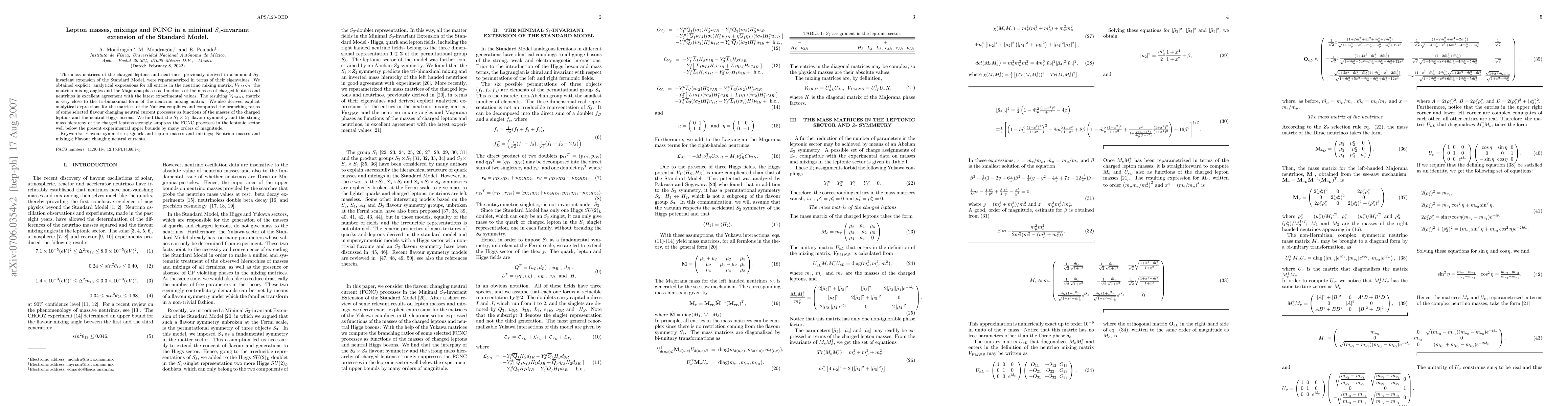This paper reparametrizes mass matrices in a minimal S_3-invariant extension of the Standard Model, deriving analytical expressions for the neutrino mixing matrix and FCNC processes. The resulting V_PMNS matrix closely matches the tri-bimaximal form and FCNC processes are suppressed well below experimental limits.