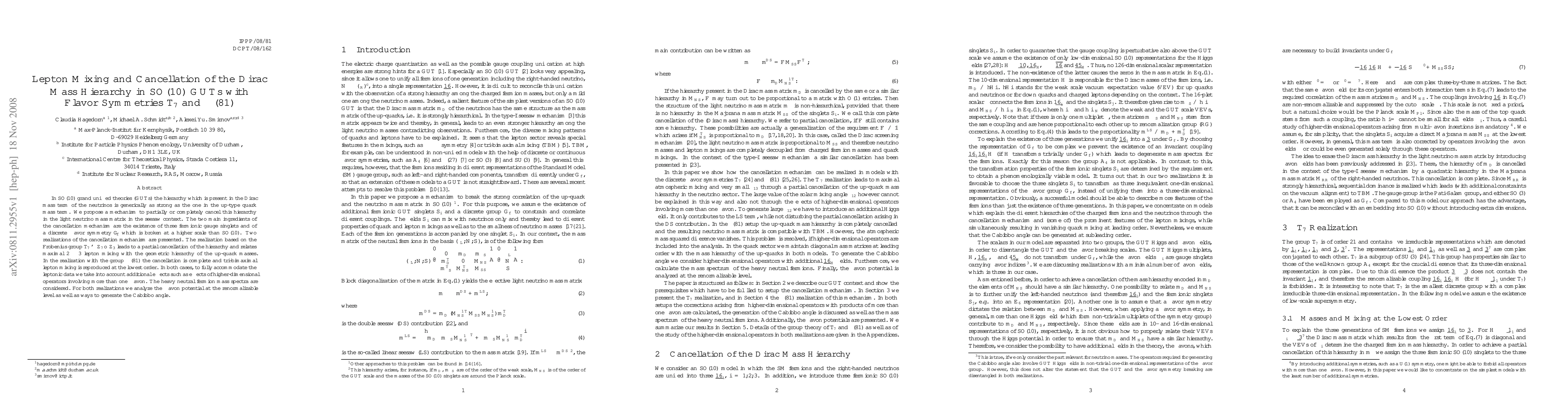 This paper proposes mechanisms to cancel the strong hierarchy in the Dirac mass term of neutrinos within SO(10) GUTs using flavor symmetries T7 and Sigma(81). It presents two realizations: one leading to partial cancellation and maximal 2-3 lepton mixing, and another achieving complete cancellation and tri-bimaximal mixing, both considering additional effects for full leptonic data accommodation.