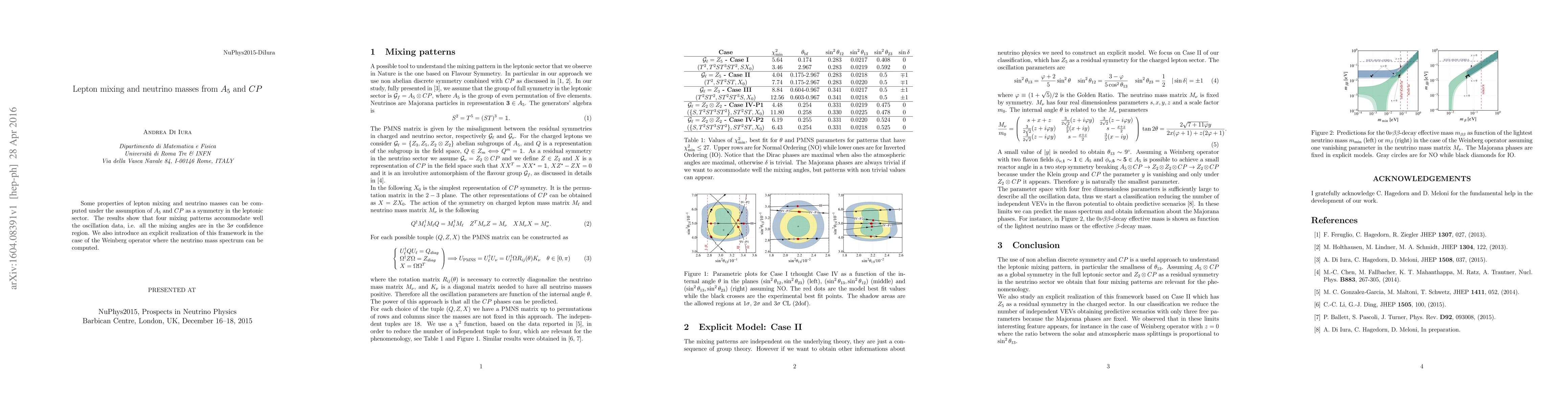 This paper explores lepton mixing and neutrino masses under the symmetry assumptions of A5 and CP, finding four viable mixing patterns that align with oscillation data. It also provides a concrete model for the Weinberg operator to compute the neutrino mass spectrum.