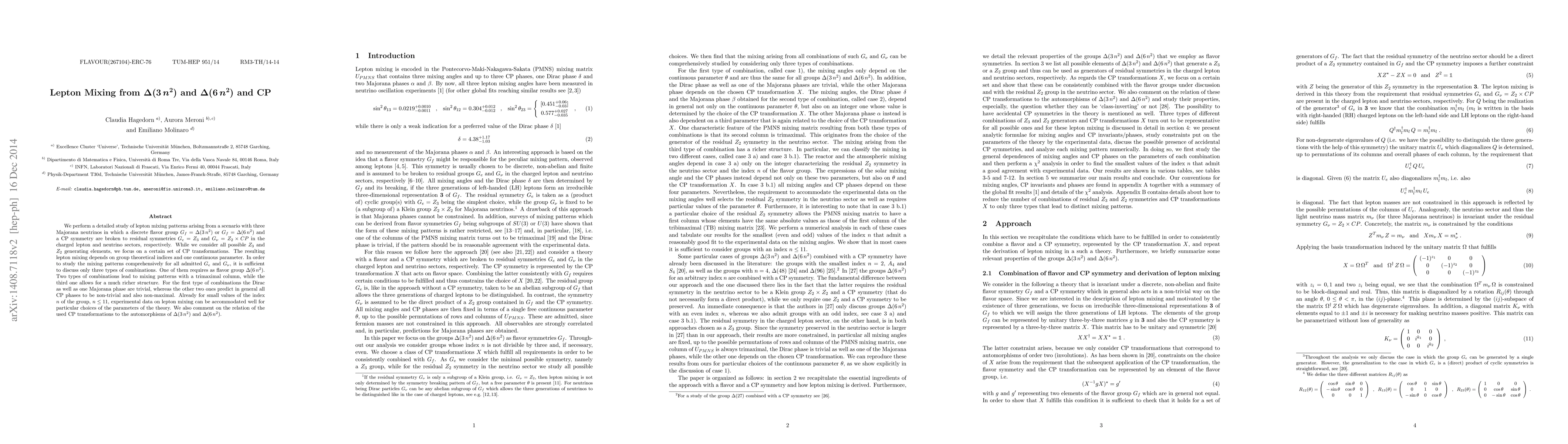 We perform a detailed study of lepton mixing patterns arising from a scenario with three Majorana neutrinos in which a discrete flavor group Gf=Delta (3 n^2) or Gf=Delta(6 n^2) and a CP symmetry are broken to residual symmetries Ge=Z3 and Gnu=Z2 x CP in the charged lepton and neutrino sectors, respectively. While we consider all possible Z3 and Z2 generating elements, we focus on a certain set of CP transformations. The resulting lepton mixing depends on group theoretical indices and one continuous parameter. In order to study the mixing patterns comprehensively for all admitted Ge and Gnu, it is sufficient to discuss only three types of combinations. One of them requires as flavor group Delta (6 n^2). Two types of combinations lead to mixing patterns with a trimaximal column, while the third one allows for a much richer structure. For the first type of combinations the Dirac as well as one Majorana phase are trivial, whereas the other two ones predict in general all CP phases to be non-trivial and also non-maximal. Already for small values of the index n of the group, n <= 11, experimental data on lepton mixing can be accommodated well for particular choices of the parameters of the theory. We also comment on the relation of the used CP transformations to the automorphisms of Delta (3 n^2) and Delta (6 n^2).
