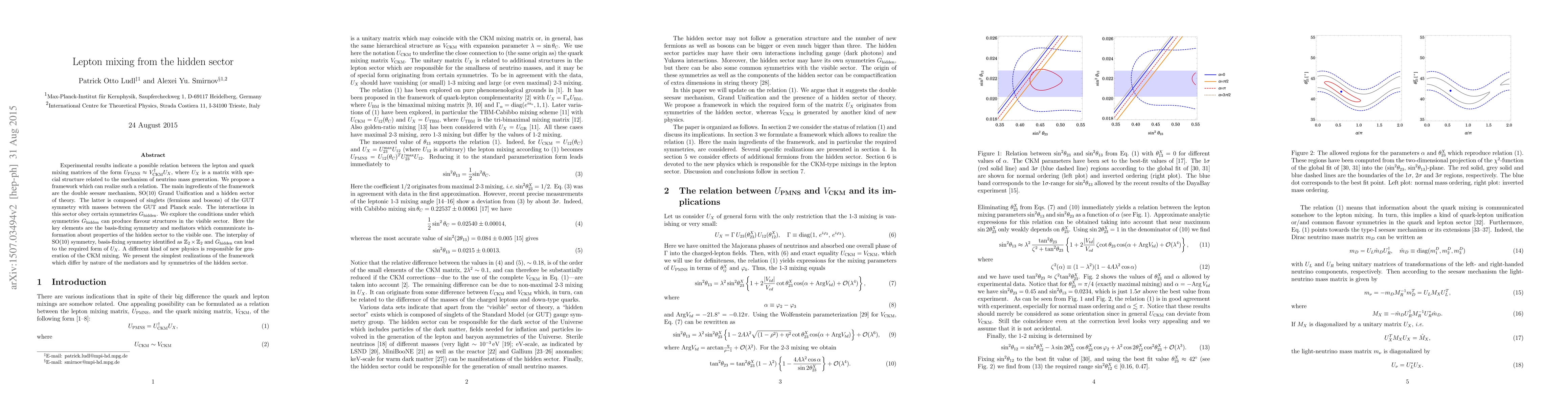 Experimental results indicate a possible relation between the lepton and quark mixing matrices of the form U_PMNS \approx V_CKM^\dagger U_X, where U_X is a matrix with special structure related to the mechanism of neutrino mass generation. We propose a framework which can realize such a relation. The main ingredients of the framework are the double seesaw mechanism, SO(10) Grand Unification and a hidden sector of theory. The latter is composed of singlets (fermions and bosons) of the GUT symmetry with masses between the GUT and Planck scale. The interactions in this sector obey certain symmetries G_hidden. We explore the conditions under which symmetries G_hidden can produce flavour structures in the visible sector. Here the key elements are the basis-fixing symmetry and mediators which communicate information about properties of the hidden sector to the visible one. The interplay of SO(10) symmetry, basis-fixing symmetry identified as Z2 x Z2 and G_hidden can lead to the required form of U_X. A different kind of new physics is responsible for generation of the CKM mixing. We present the simplest realizations of the framework which differ by nature of the mediators and by symmetries of the hidden sector.