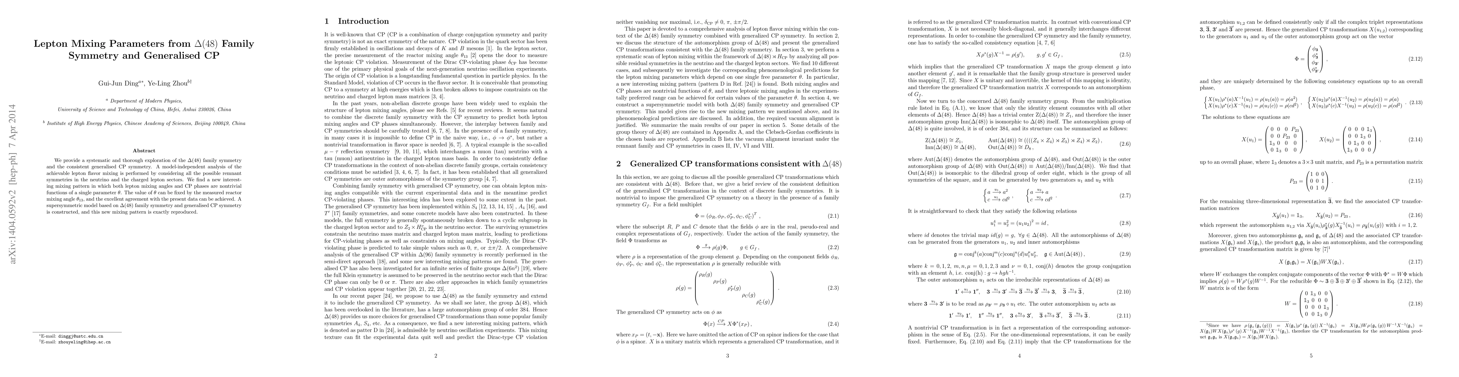 This paper explores the $\Delta(48)$ family symmetry and generalised CP symmetry to derive a new lepton mixing pattern where both mixing angles and CP phases depend on a single parameter $\theta$. The parameter $\theta$ is fixed by the reactor mixing angle $\theta_{13}$, achieving excellent agreement with current data, and a supersymmetric model is constructed to reproduce this pattern.