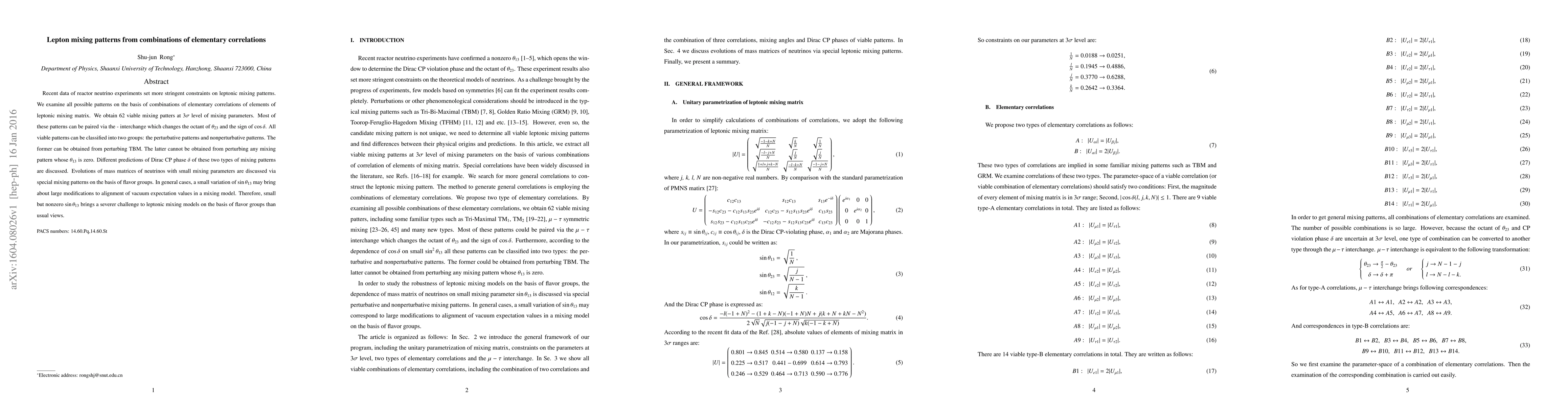 Recent data of reactor neutrino experiments set more stringent constraint on leptonic mixing patterns. We examine all possible patterns on the basis of combinations of elementary correlations of elements of leptonic mixing matrix. we obtain 62 viable mixing patters at 3$\sigma$ level of mixing parameters. Most of these patterns can be paired via the {\mu}- interchange which changes the octant of $\theta_{23}$ and the sign of $\cos{\delta}$. All viable patterns can be classified into two groups: the perturbative patterns and non-perturbative patterns. The former can be obtained from perturbing TBM. The latter cannot be obtained from perturbing any mixing pattern whose $\theta_{13}$ is zero. Different predictions of Dirac CP phase $\delta$ of these two types of mixing patterns are discussed. Evolutions of mass matrices of neutrinos with small mixing parameters are discussed via special mixing patterns on the basis of flavor groups. In general cases, a small variation of $\sin\theta_{13}$ may bring about large modifications to alignment of vacuum expectation values in a mixing model. Therefore, small but nonzero $\sin\theta_{13}$ brings a severer challenge to leptonic mixing models on the basis of flavor groups than usual views.