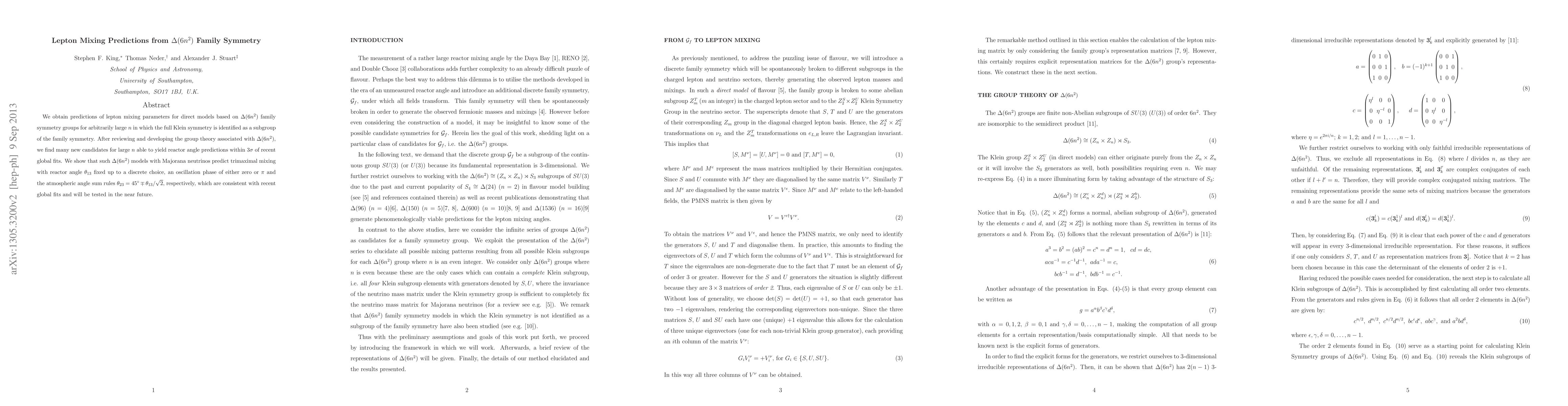 This paper presents predictions for lepton mixing parameters under Delta(6n^2) family symmetry, identifying Klein symmetry as a subgroup. It finds numerous models for large n that align with recent experimental data, predicting trimaximal mixing with specific fixed reactor and atmospheric angles consistent with current global fits.