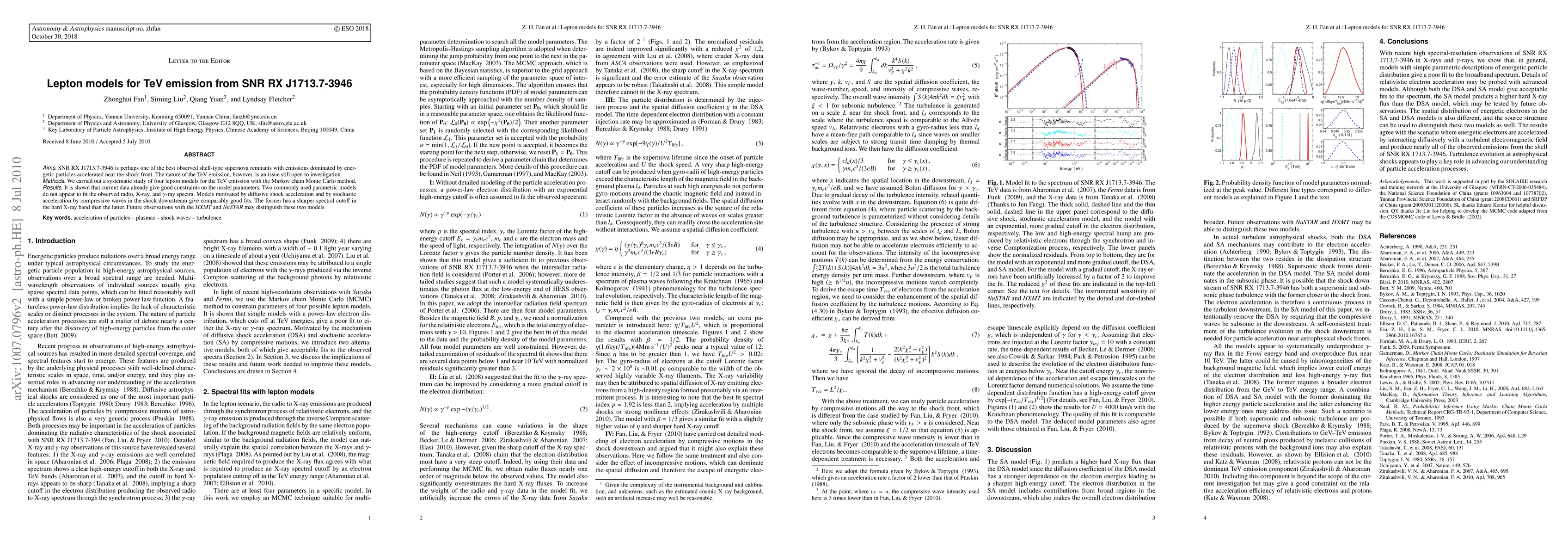 This paper investigates TeV emission from SNR RX J1713.7-3946 using four lepton models, finding that current data constrain model parameters well. While two common parametric models do not fit the observed spectra, models based on diffusive shock acceleration and stochastic acceleration show better fits, with future observations potentially distinguishing between them.