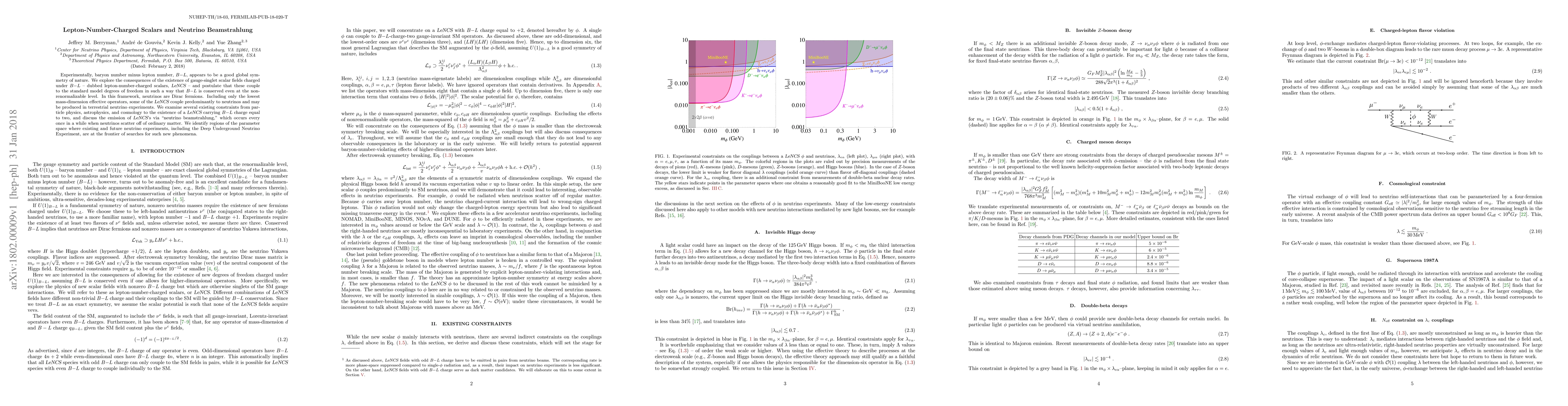 Experimentally, baryon number minus lepton number, $B-L$, appears to be a good global symmetry of nature. We explore the consequences of the existence of gauge-singlet scalar fields charged under $B-L$ -- dubbed lepton-number-charged scalars, LeNCS -- and postulate that these couple to the standard model degrees of freedom in such a way that $B-L$ is conserved even at the non-renormalizable level. In this framework, neutrinos are Dirac fermions. Including only the lowest mass-dimension effective operators, some of the LeNCS couple predominantly to neutrinos and may be produced in terrestrial neutrino experiments. We examine several existing constraints from particle physics, astrophysics, and cosmology to the existence of a LeNCS carrying $B-L$ charge equal to two, and discuss the emission of LeNCS's via "neutrino beamstrahlung," which occurs every once in a while when neutrinos scatter off of ordinary matter. We identify regions of the parameter space where existing and future neutrino experiments, including the Deep Underground Neutrino Experiment, are at the frontier of searches for such new phenomena.