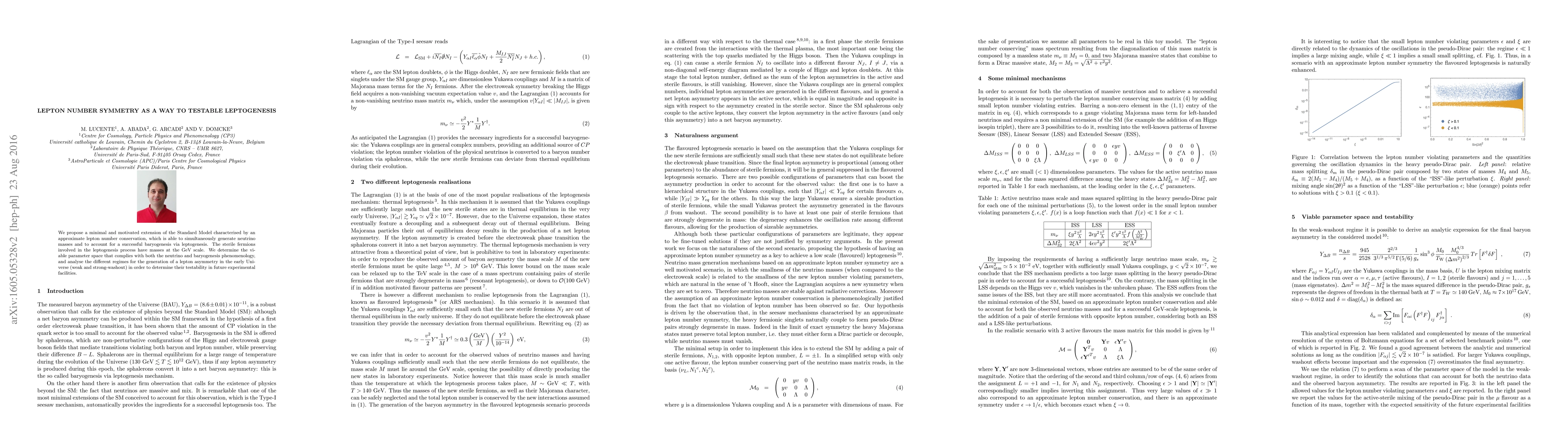 This paper proposes a model that combines lepton number symmetry with leptogenesis to generate neutrino masses and account for successful baryogenesis, and analyzes the testability of its predictions in future experimental facilities.