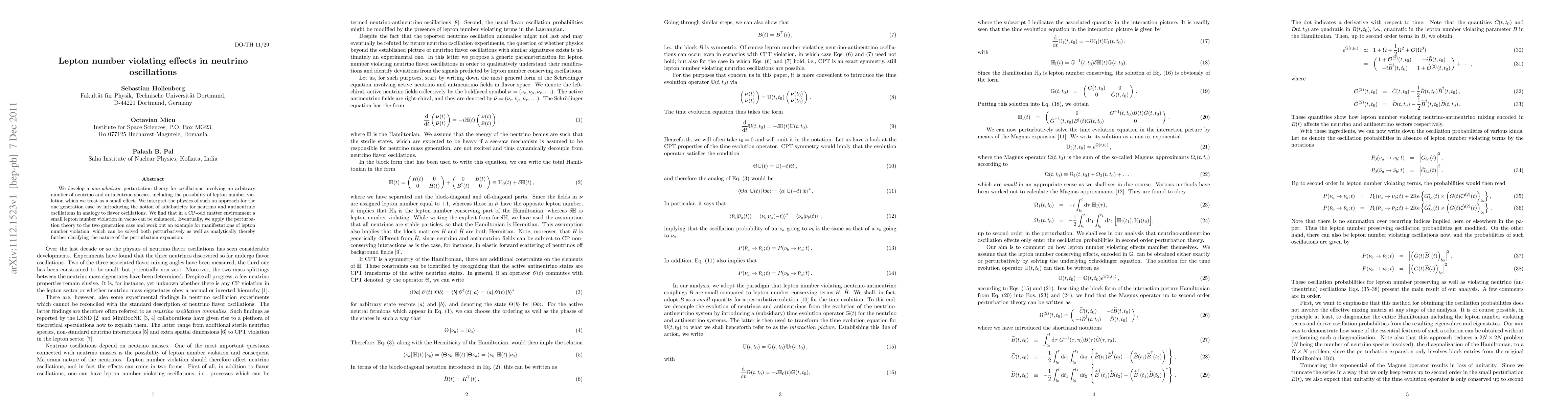 This paper develops a non-adiabatic perturbation theory for neutrino oscillations, considering lepton number violation, and applies it to a two-generation case. It highlights how lepton number violation can be enhanced in CP-odd matter environments and provides both perturbative and analytical solutions for a specific example.