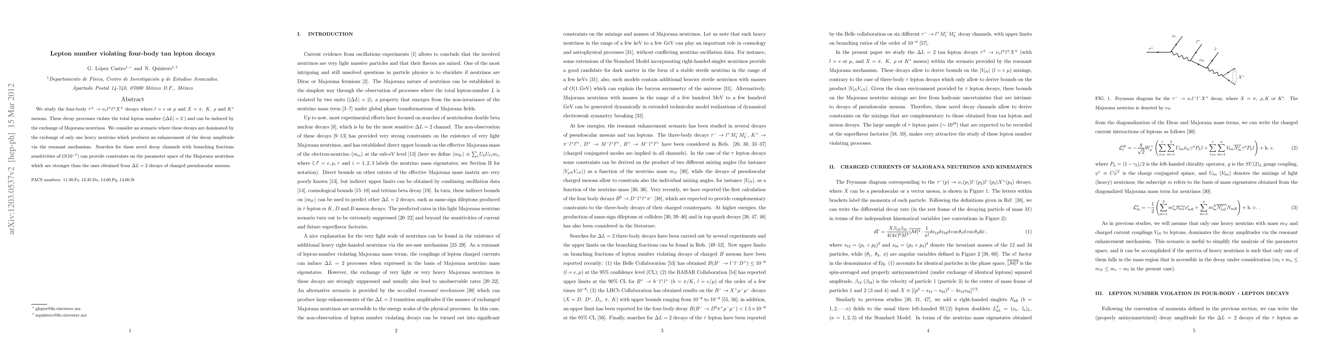 We study the four-body tau^+- -> nu_tau l^+- l^+- X^-+ decays where l=e or mu and X=pi, K, rho and K^* mesons. These decay processes violate the total lepton number (|Delta L|=2) and can be induced by the exchange of Majorana neutrinos. We consider an scenario where these decays are dominated by the exchange of only one heavy neutrino which produces an enhancement of the decay amplitude via the resonant mechanism. Searches for these novel decay channels with branching fractions sensitivities of (10^-7) can provide constraints on the parameter space of the Majorana neutrinos which are stronger than the ones obtained from Delta L=2 decays of charged pseudoscalar mesons.