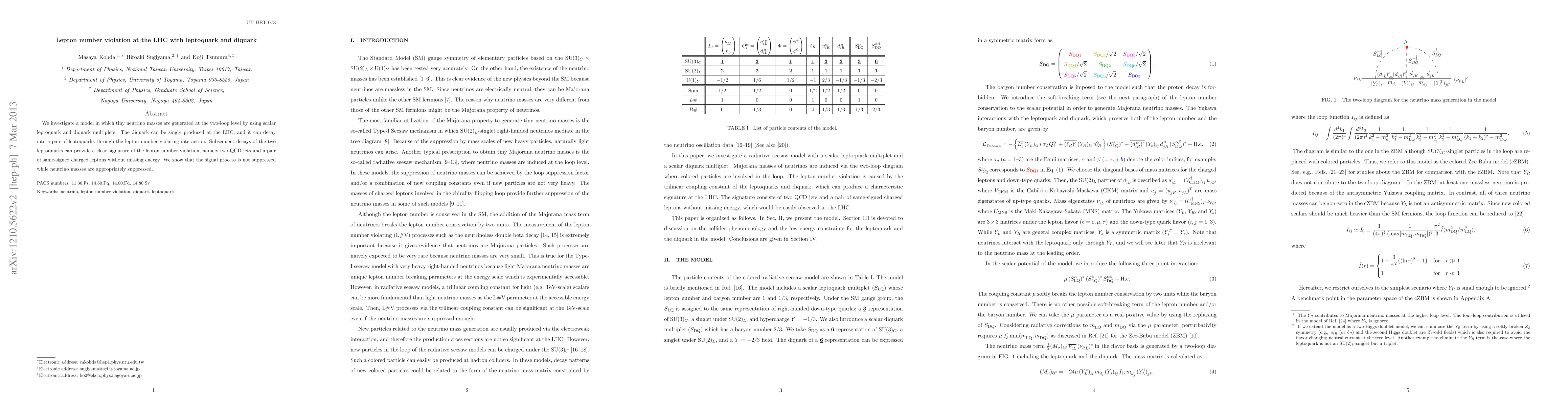 This research explores a model where tiny neutrino masses arise via two-loop interactions involving scalar leptoquarks and diquarks. The LHC can produce diquarks that decay into a pair of leptoquarks, signaling lepton number violation through two QCD jets and same-signed charged leptons without missing energy, without suppressing the signal.