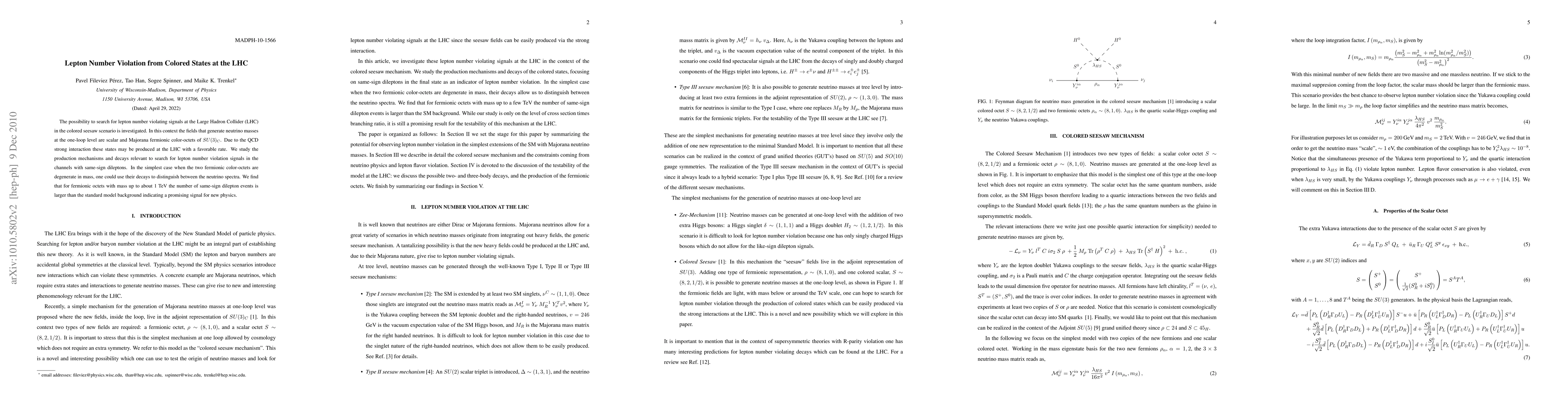 The possibility to search for lepton number violating signals at the Large Hadron Collider (LHC) in the colored seesaw scenario is investigated. In this context the fields that generate neutrino masses at the one-loop level are scalar and Majorana fermionic color-octets of SU(3). Due to the QCD strong interaction these states may be produced at the LHC with a favorable rate. We study the production mechanisms and decays relevant to search for lepton number violation signals in the channels with same-sign dileptons. In the simplest case when the two fermionic color-octets are degenerate in mass, one could use their decays to distinguish between the neutrino spectra. We find that for fermionic octets with mass up to about 1 TeV the number of same-sign dilepton events is larger than the standard model background indicating a promising signal for new physics.