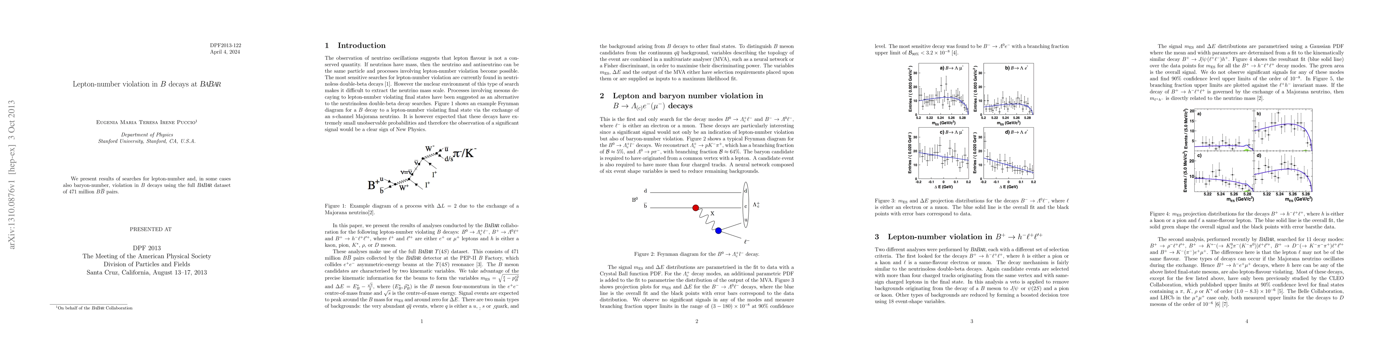 Summary: This study investigates lepton-number and baryon-number violation in B meson decays using the complete BaBar dataset of 471 million BBbar pairs, reporting findings on potential lepton-number violation in B decays. The results contribute to understanding fundamental symmetries in particle physics.