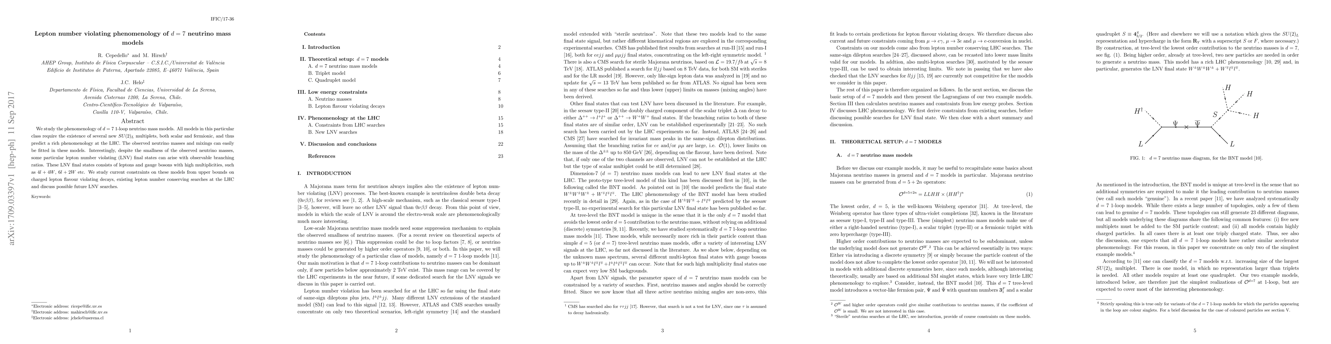 We study the phenomenology of d=7 1-loop neutrino mass models. All models in this particular class require the existence of several new $SU(2)_L$ multiplets, both scalar and fermionic, and thus predict a rich phenomenology at the LHC. The observed neutrino masses and mixings can easily be fitted in these models. Interestingly, despite the smallness of the observed neutrino masses, some particular lepton number violating (LNV) final states can arise with observable branching ratios. These LNV final states consists of leptons and gauge bosons with high multiplicities, such as 4l+4W, 6l+2W, etc. We study current constraints on these models from upper bounds on charged lepton flavour violating decays, existing lepton number conserving searches at the LHC and discuss possible future LNV searches.