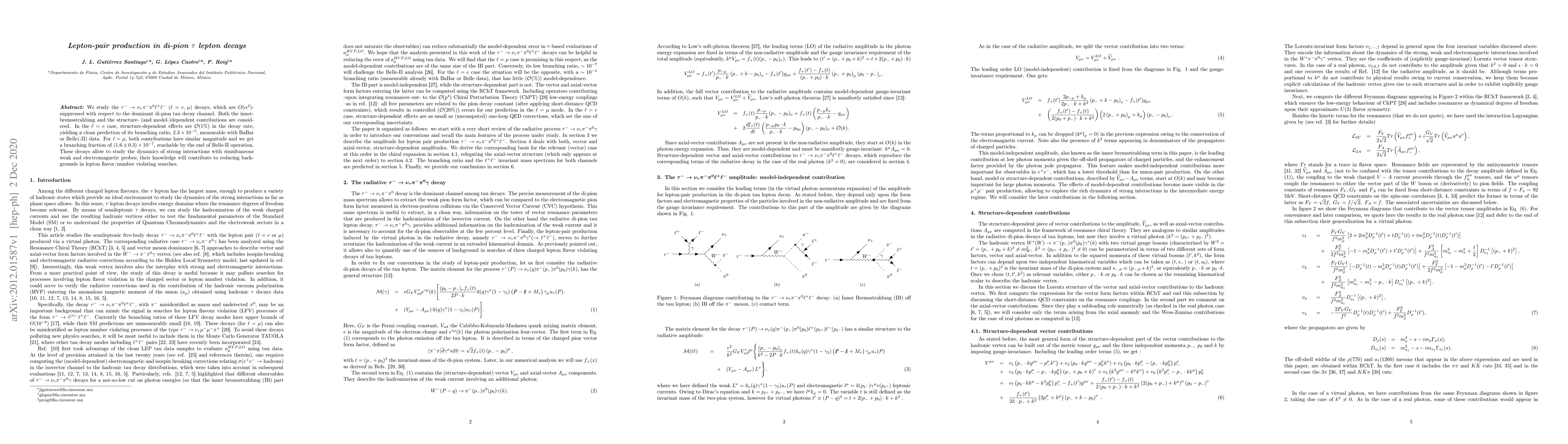 This paper investigates the rare $\tau^- \to \nu_{\tau} \pi^{-}\pi^{0}\ell^{+}\ell^{-}$ decays, focusing on lepton-pair production alongside di-pion emissions. It provides precise branching ratios for both electron and muon lepton pairs, with predictions of $2.3\times10^{-5}$ and $(1.6\pm0.3)\times10^{-7}$, respectively, potentially measurable with current and future experiments.