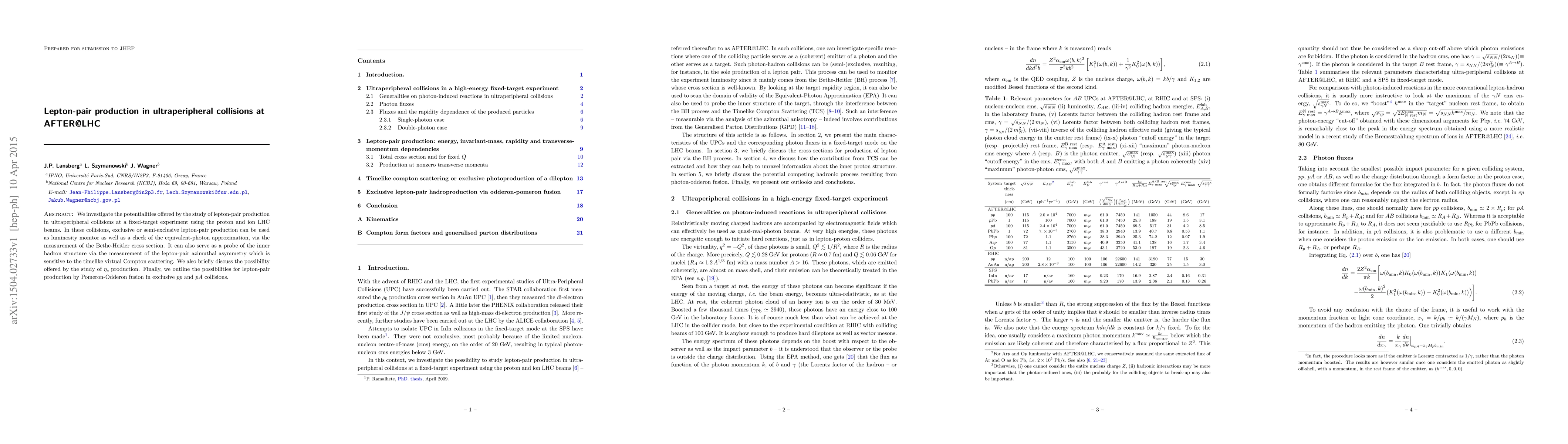 This paper explores lepton-pair production in ultraperipheral collisions at AFTER@LHC, using proton and ion beams to monitor luminosity and test the equivalent-photon approximation, while also probing hadron structure via azimuthal asymmetry measurements. It briefly mentions eta(c) production and potential Pomeron-Odderon fusion processes.