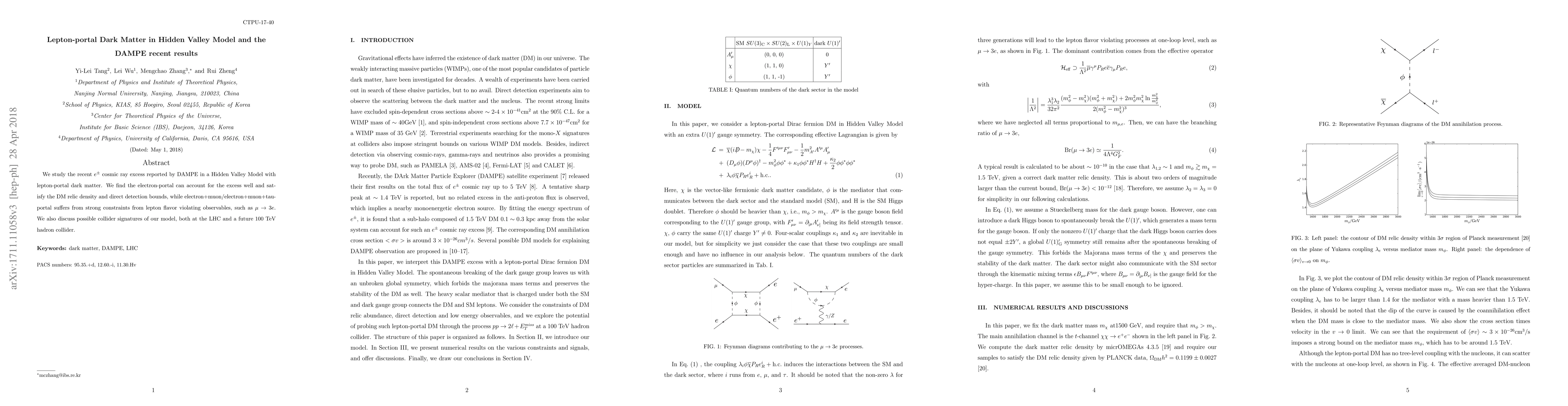 We study the recent $e^\pm$ cosmic ray excess reported by DAMPE in a Hidden Valley Model with lepton-portal dark matter. We find the electron-portal can account for the excess well and satisfy the DM relic density and direct detection bounds, while electron+muon/electron+muon+tau-portal suffers from strong constraints from lepton flavor violating observables, such as $\mu \to 3 e$. We also discuss possible collider signatures of our model, both at the LHC and a future 100 TeV hadron collider.