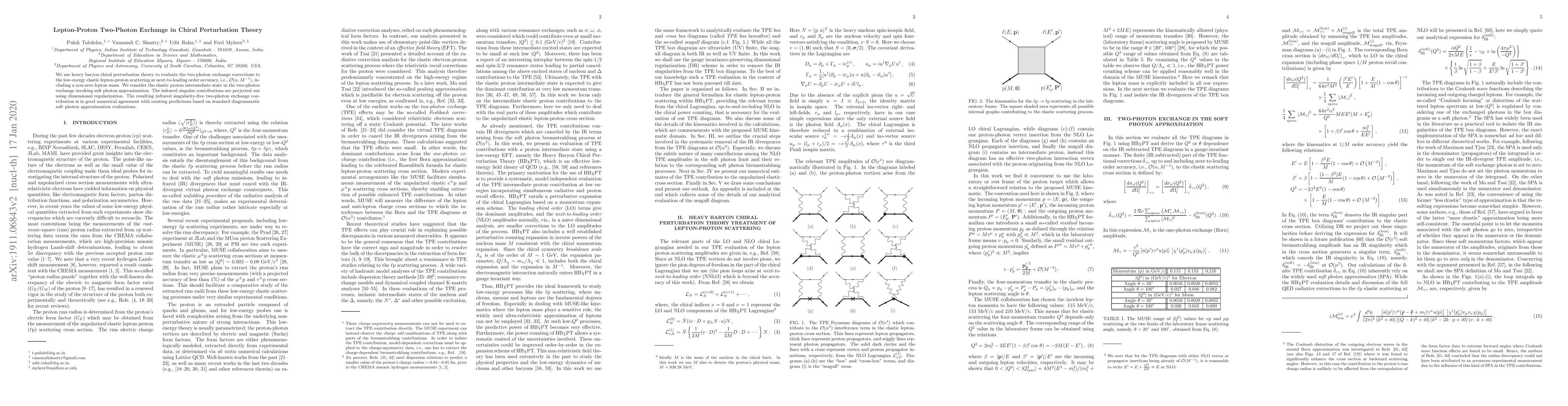 We use heavy baryon chiral perturbation theory to evaluate the two-photon exchange corrections to the low-energy elastic lepton-proton scattering at next-to-leading order accuracy, i.e., ${\mathcal O}(\alpha, M^{-1})$, including a non-zero lepton mass. We consider the elastic proton intermediate state in the two-photon exchange together in the soft photon approximation. The infrared singular contributions are projected out using dimensional regularization. The resulting infrared singularity-free two-photon exchange contribution is in good numerical agreement with existing predictions based on standard diagrammatic soft photon approximation evaluations.
