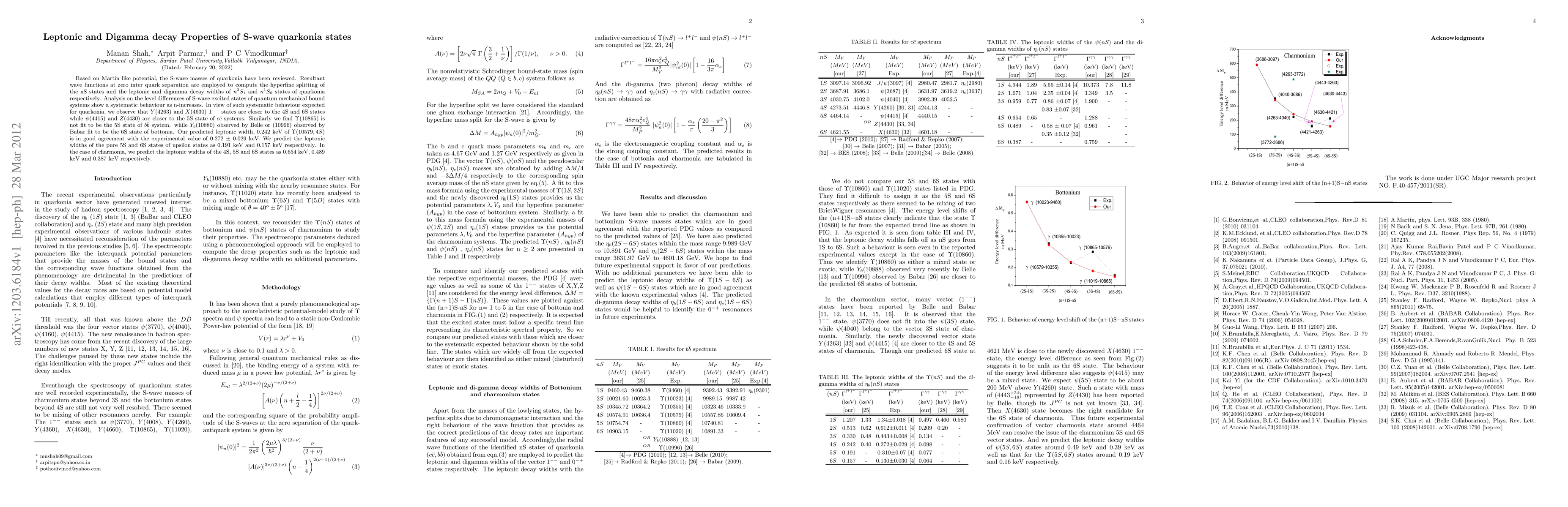Based on Martin like potential, the S-wave masses of quarkonia have been reviewed. Resultant wave functions at zero inter quark separation are employed to compute the hyperfine splitting of the nS states and the leptonic and digamma decay widths of $n{^3S_1}$ and $n{^1S_0}$ states of quarkonia respectively. Analysis on the level differences of S-wave excited states of quantum mechanical bound systems show a systematic behaviour as n-increases. In view of such systematic behaviour expected for quarkonia, we observe that Y(4263) and X(4630) $1^{--}$ states are closer to the 4S and 6S states while $\psi(4415)$ and Z(4430) are closer to the 5S state of $c\bar{c}$ systems. Similarly we find $\Upsilon (10865)$ is not fit to be the 5S state of $b\bar{b}$ system. while $Y_b (10880)$ observed by Belle or (10996) observed by Babar fit to be the 6S state of bottonia. Our predicted leptonic width, 0.242 keV of $\Upsilon (10579, 4S)$ is in good agreement with the experimental value of 0.272 $\pm$ 0.029 keV. We predict the leptonic widths of the pure 5S and 6S states of upsilon states as 0.191 keV and 0.157 keV respectively. In the case of charmonia, we predict the leptonic widths of the 4S, 5S and 6S states as 0.654 keV, 0.489 keV and 0.387 keV respectively.